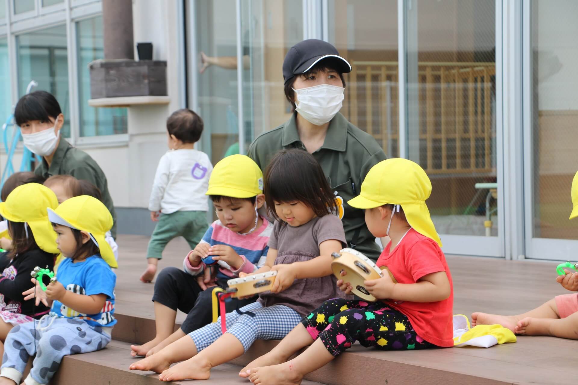 タンバリンや鈴などの楽器に興味をもつ子どもたち