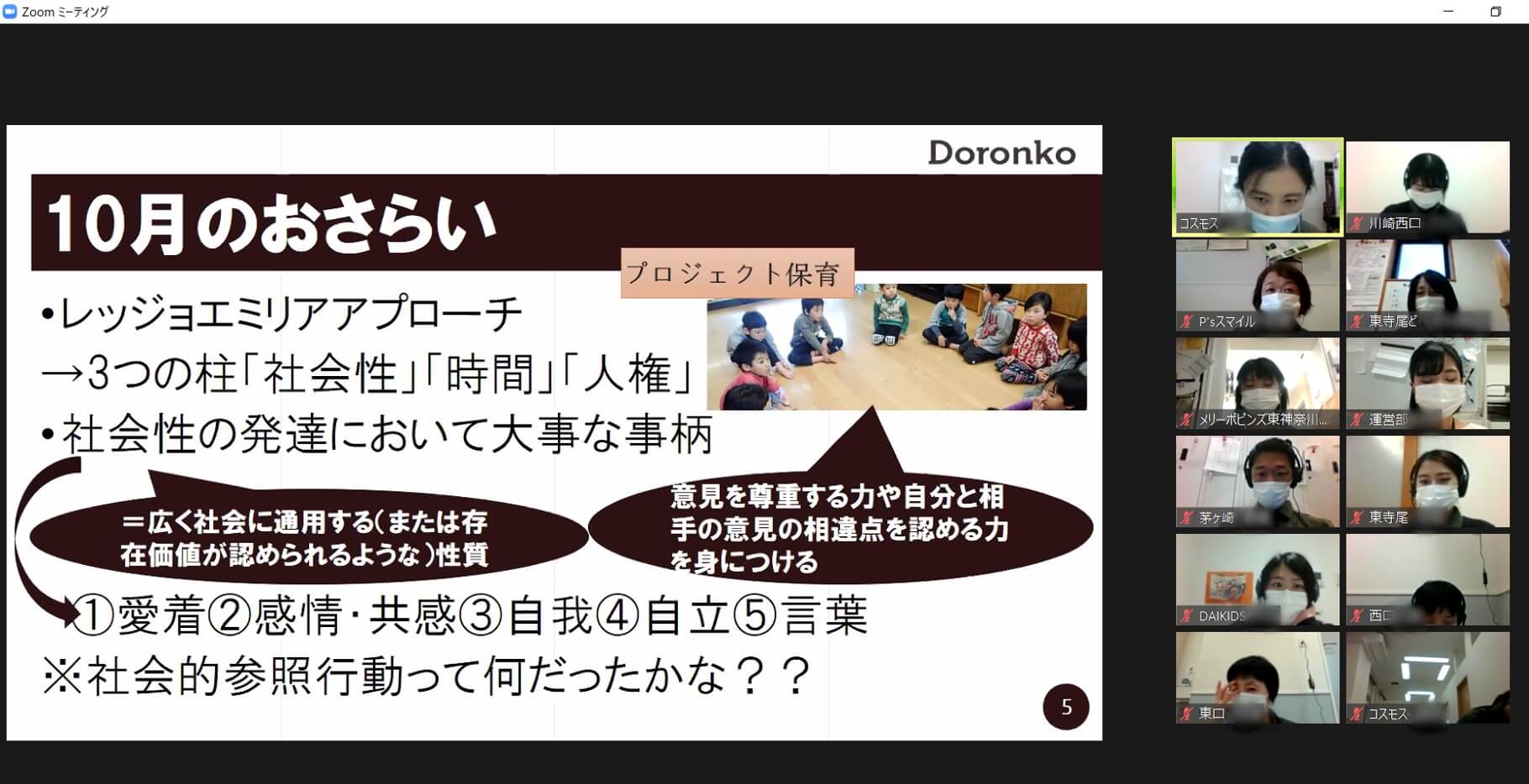 田中施設長:どろんこ会グループは保育園も発達支援つむぎも、同じエリアの施設が集まってさまざまな会議や勉強会を一緒に実施しています。保育園の取り組みから学ぶことも多く、その一つが中村施設長から教わった保育ドキュメンテーション(保育中の出来事や子どもの様子についてエピソードを伝える文章と写真で記録したもの)です。
