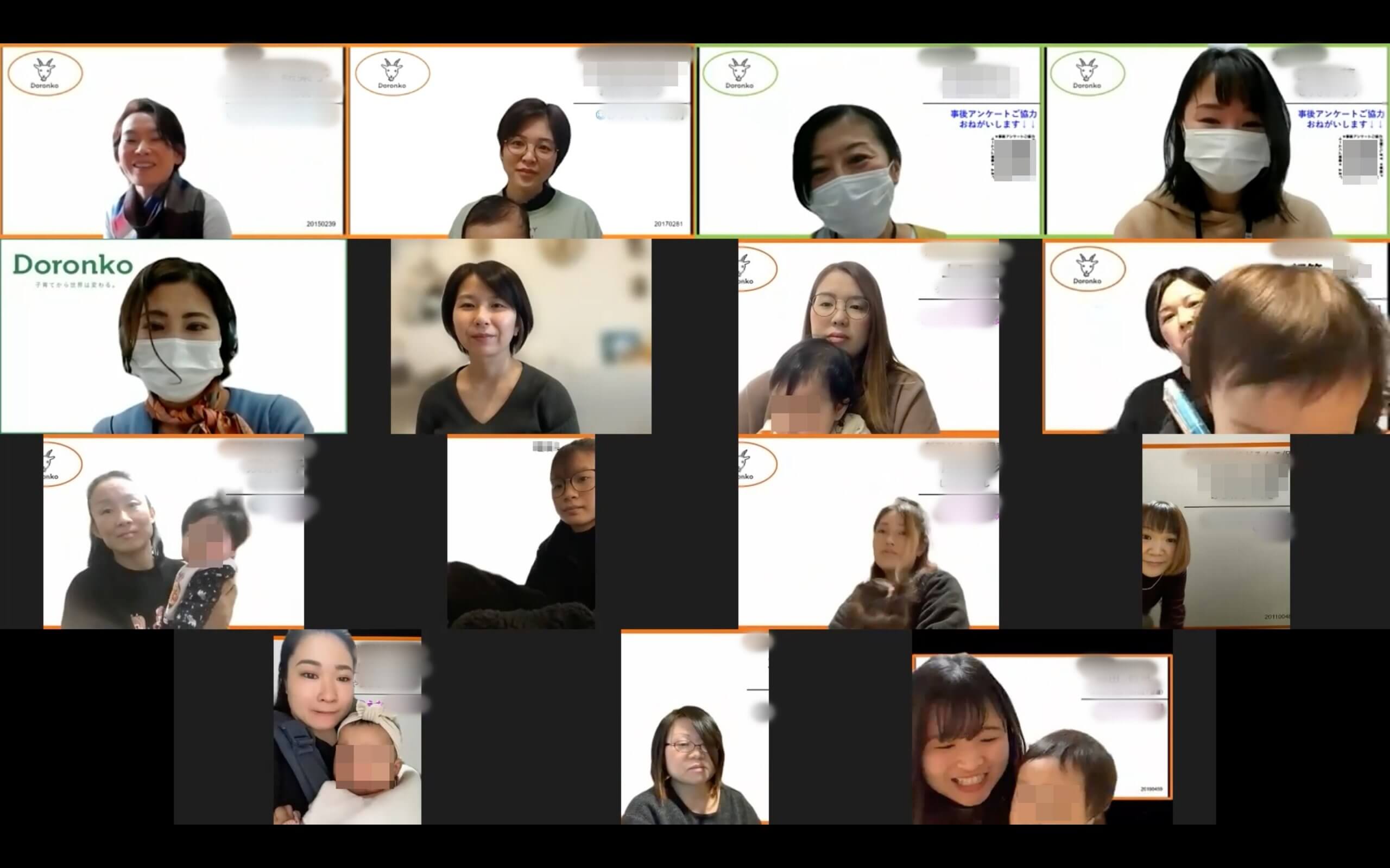 参加者の皆さんは、子どもの月齢が異なるだけでなく、第1子を出産したばかりの人から、小・中学生2人のお子さんがいて今回が3人目という人までさまざまです。子どもたちも一緒に参加して、画面に興味津々の様子。途中、子どもがカメラに向かって手を振る様子なども見られ、終始和やかに進みました。