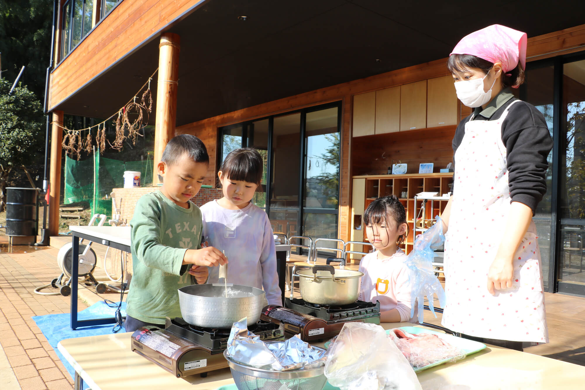 解体を終えると、次はブリ大根作りに挑戦です。こめ組(5歳児)の子どもたちは 野菜を切ったりお米をといだり、自分たちができることややりたいことを自分で見つけて取り組みます。