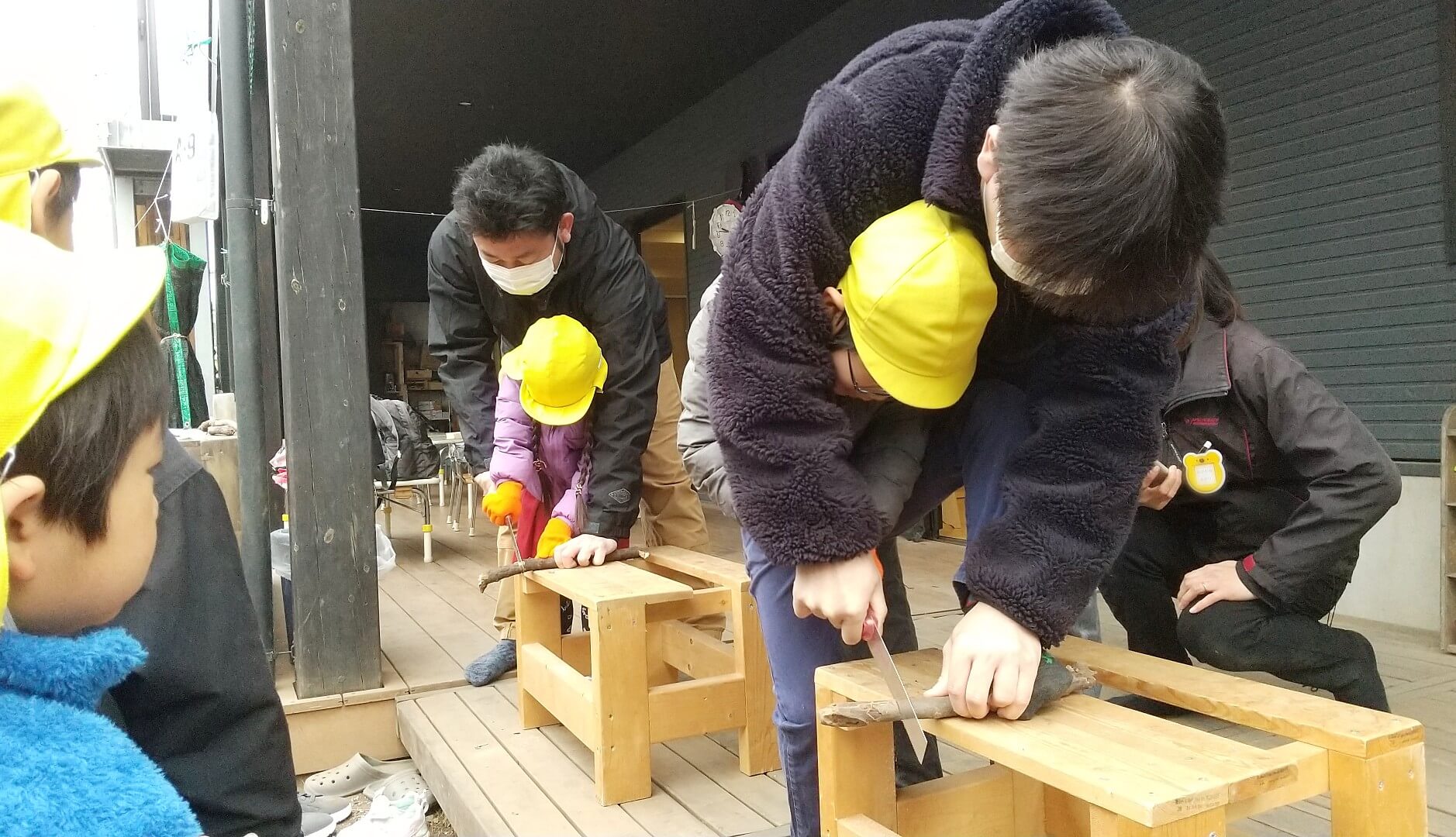 園庭では日ごろから行っている焚き火、木工スペースでのキーホルダー作り、そして大きなキャンバスに絵を描く体験を用意しました。