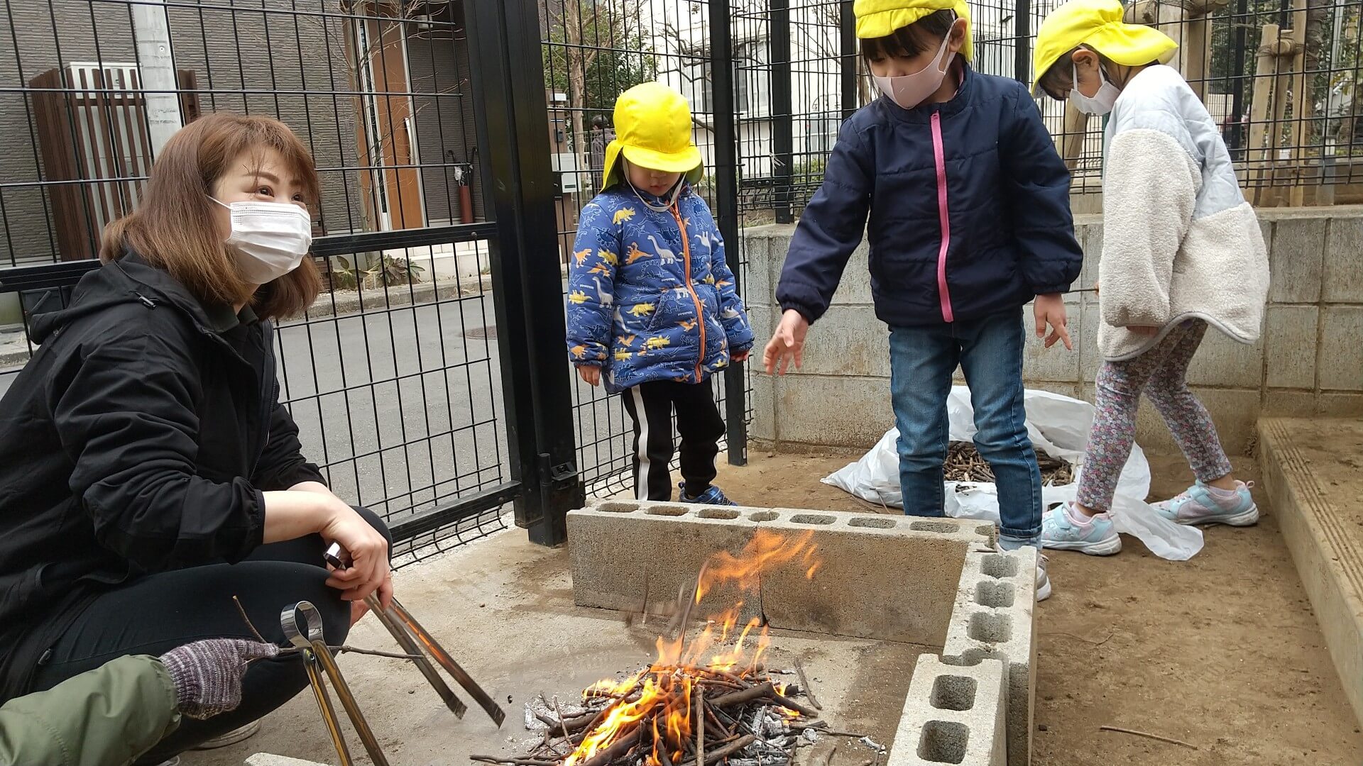 焚き火は子どもたちが日ごろから行なっているため準備もお手の物。どうやって火をおこすかを説明する姿に保護者の方が感心する姿も見られました。
