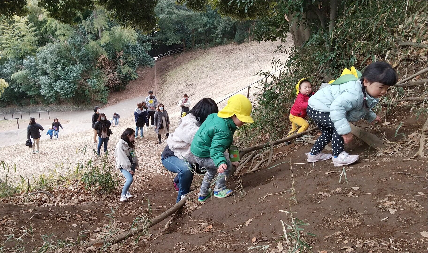西寺尾の丘公園は園から乳児の足で3~40分、幼児の足で20分の場所にあります。ここでは斜面登りとネイチャービンゴゲームを実施しました。ネイチャービンゴゲームは日ごろから自然物を拾って集めるのが大好きな子どもたちを思い浮かべて考えたお楽しみ企画です。そして斜面登りは写真の通り、なかなかの急勾配です。