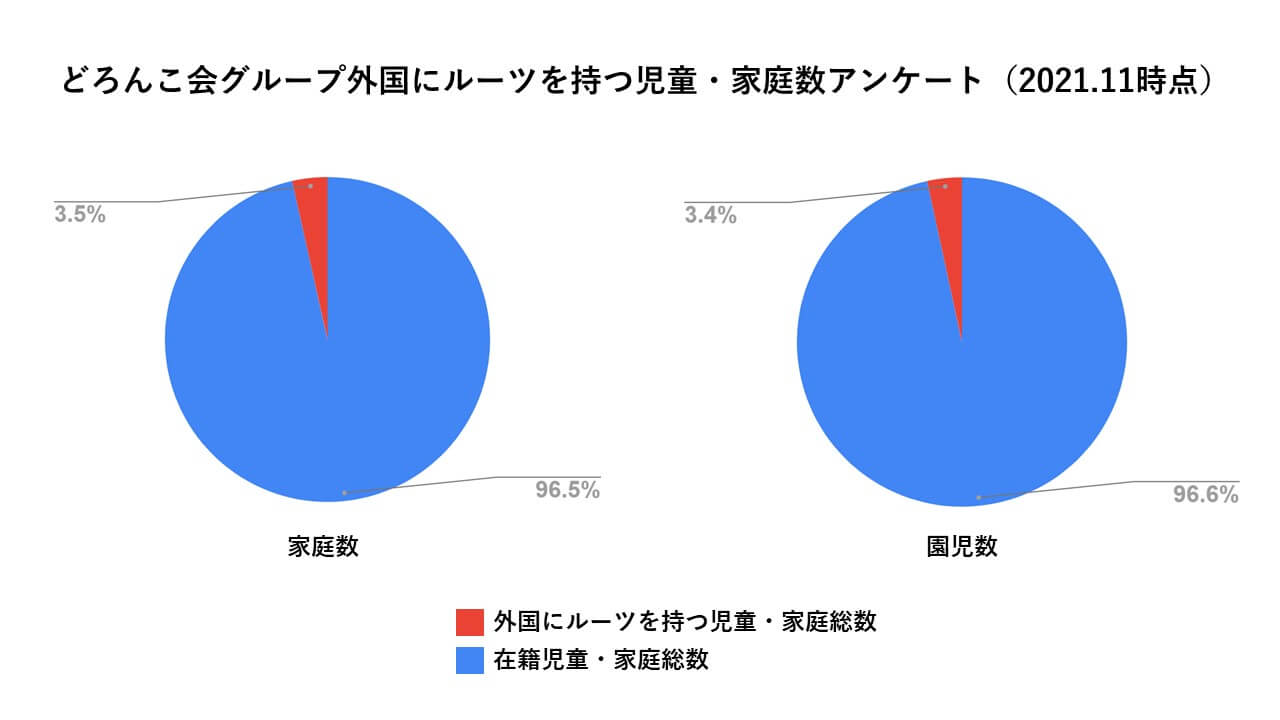 どろんこ会グループの施設においては、約6000家庭の利用者のうち、3.5%が外国籍の方です(2021年11月自社調べ)。