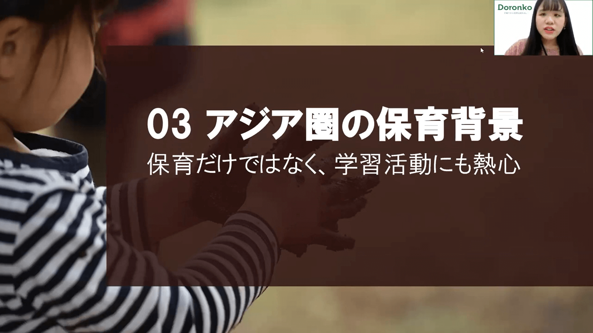 現場スタッフが参加しやすいよう、時間は子どもたちが午睡に入る13時からの40分間とし、短時間で聞きやすい内容にしました。全3回に分け、第1回目は2021年12月に「アジア圏の保育文化の違い」、第2回目は2022年2月に「食育文化の違い」をテーマに実施、第3回目は5月に「年中行事の違い」を予定しています。
