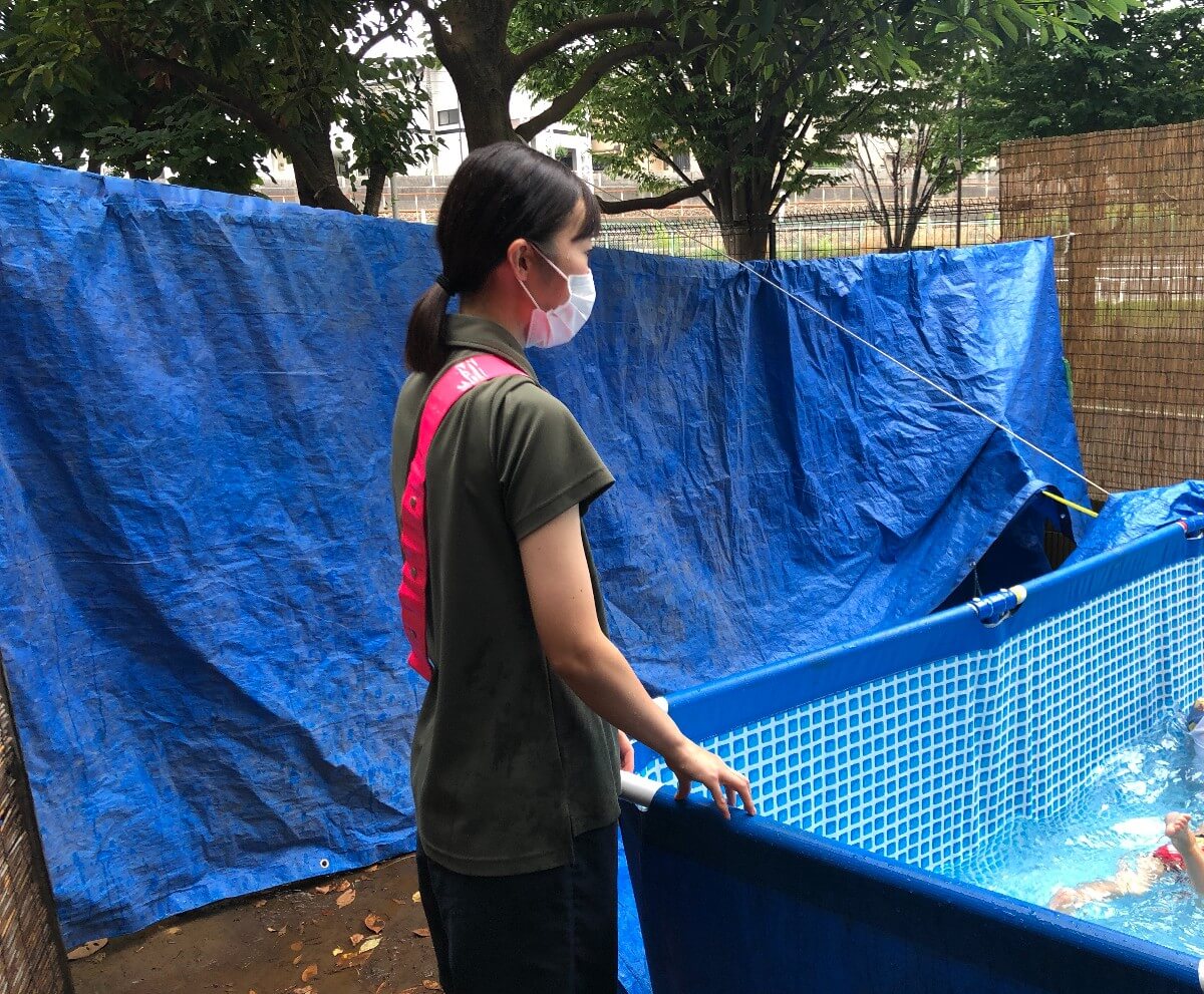 そのため一人のスタッフがずっと監視をするのでなく、20分程度で入れ替わり、水遊び中は、より高い集中力で監視できる体制にしておくことがリスクを減らすことにつながります。「スタッフの配置」について、どろんこ会グループでは、プール活動や水遊びは常に2名以上のスタッフで実施します。監視に専念するスタッフはピンクタスキを着用し、水の外に立つことがマニュアルに定められています。ポイントは「常に2名以上」です。何かの理由でスタッフ1名が離れる時は、必ず交替の1名が来てから離れるなど、一瞬であっても配置スタッフの人数に不足があってはいけません。十分な監視体制の確保ができない場合は、プールを中止することも選択肢に入れることが求められています。