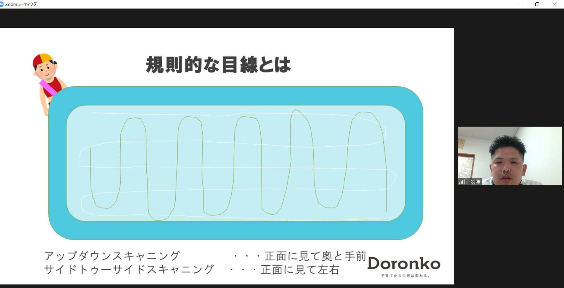 また、ただ見ているだけでは見落としがあります。羽澤施設長は、ライフセーバーの監視のポイントである「規則的な目線」について説明。園で使用する組み立て式大型プールを例に、プールの隅々まで監視できるよう、「アップダウンスキャニング」と「サイドトゥサイドスキャニング」で目を動かすこと、また、監視スタッフの真下にいる子どもも見られるよう、プールの淵に立つポイントも伝えていました。