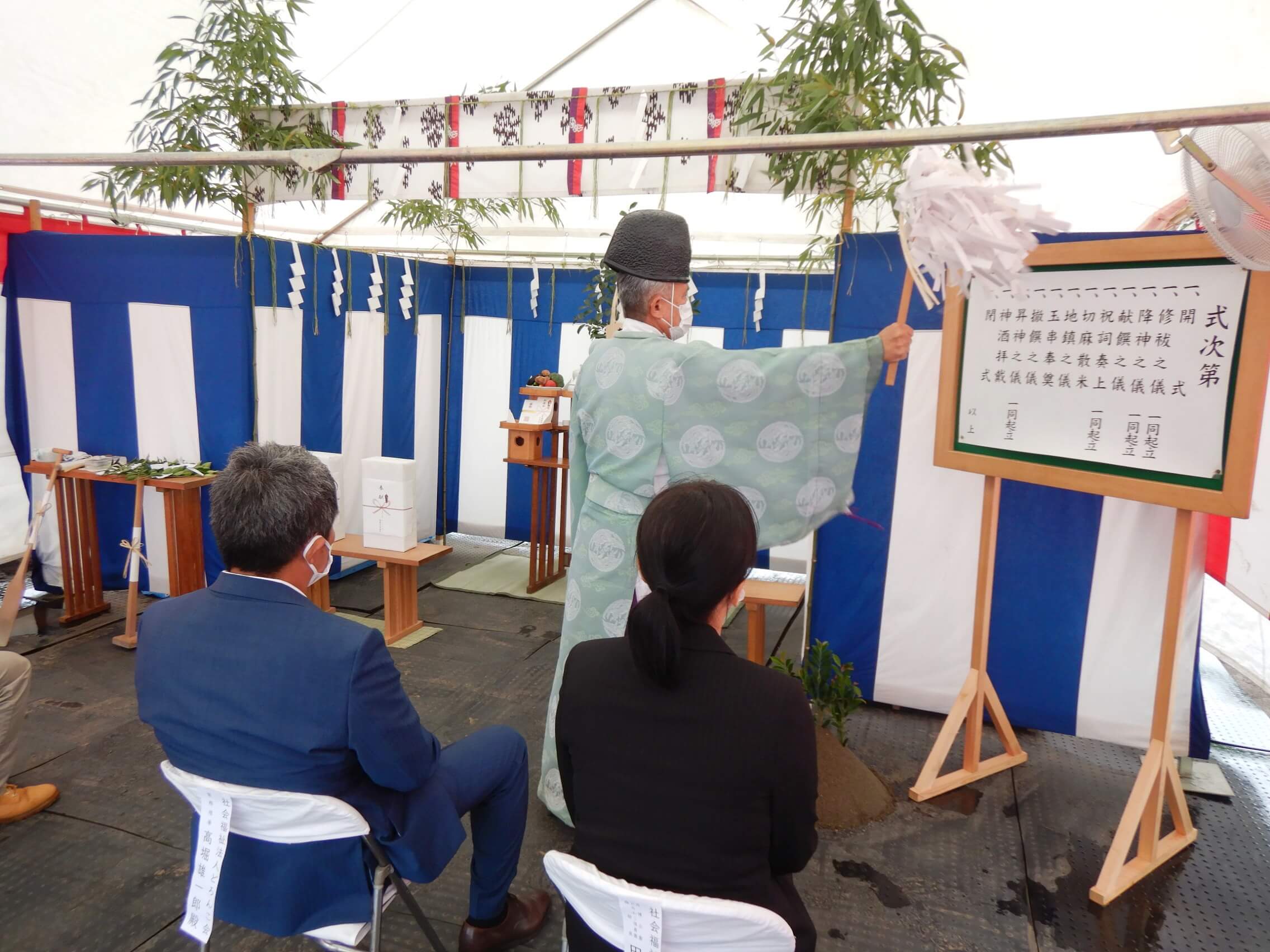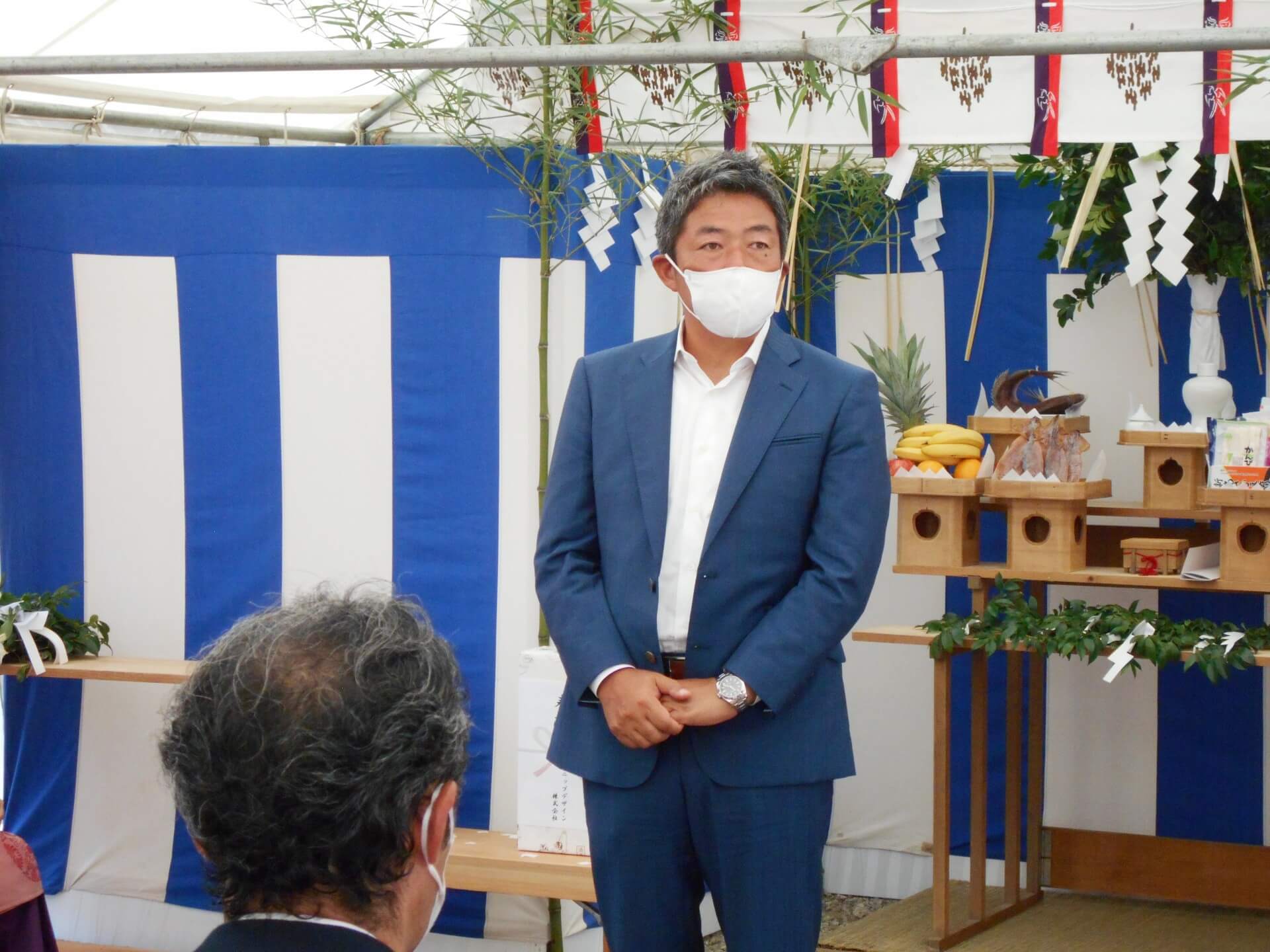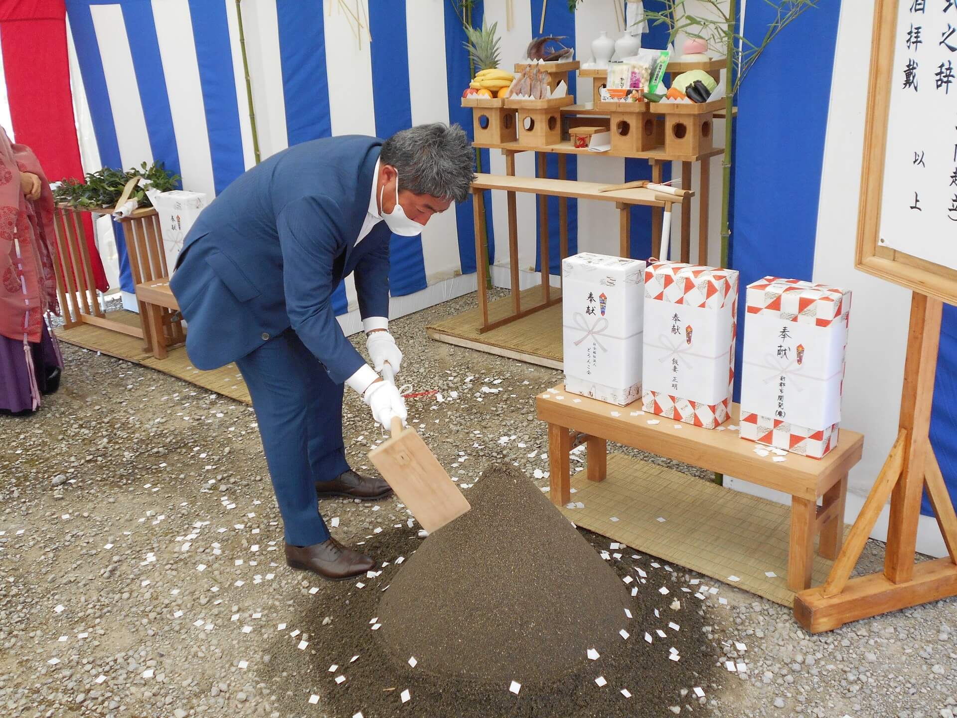 地鎮祭とは建設工事が無事終わるよう、神主の方をお招きして安全祈願をする儀式です。どろんこ会グループからは高堀代表が出席し、新園の未来を関係者と共に祈りました。