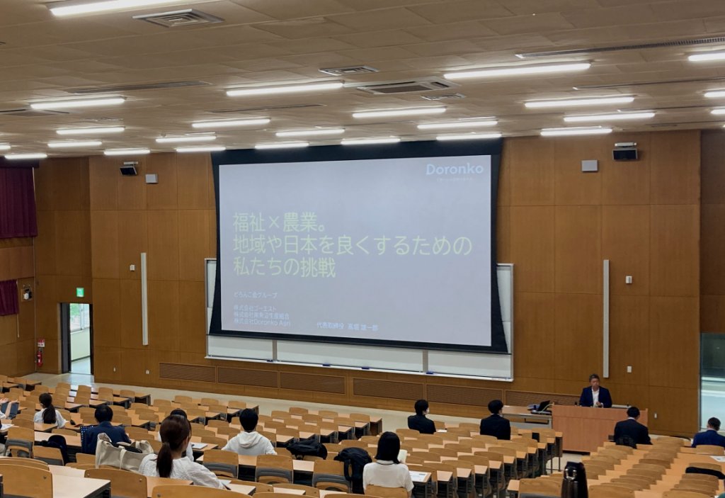 2023年6月、埼玉大学で開講されている寄附講義「地域金融×地域創生入門」に高堀代表が登壇しました。全学部の学生を対象に、埼玉県とゆかりのある企業が地域創生やSDGsなどの取り組みを紹介する講義です。高堀代表は「福祉×農業。地域や日本を良くする私たちの挑戦」と題して講義を行いました。