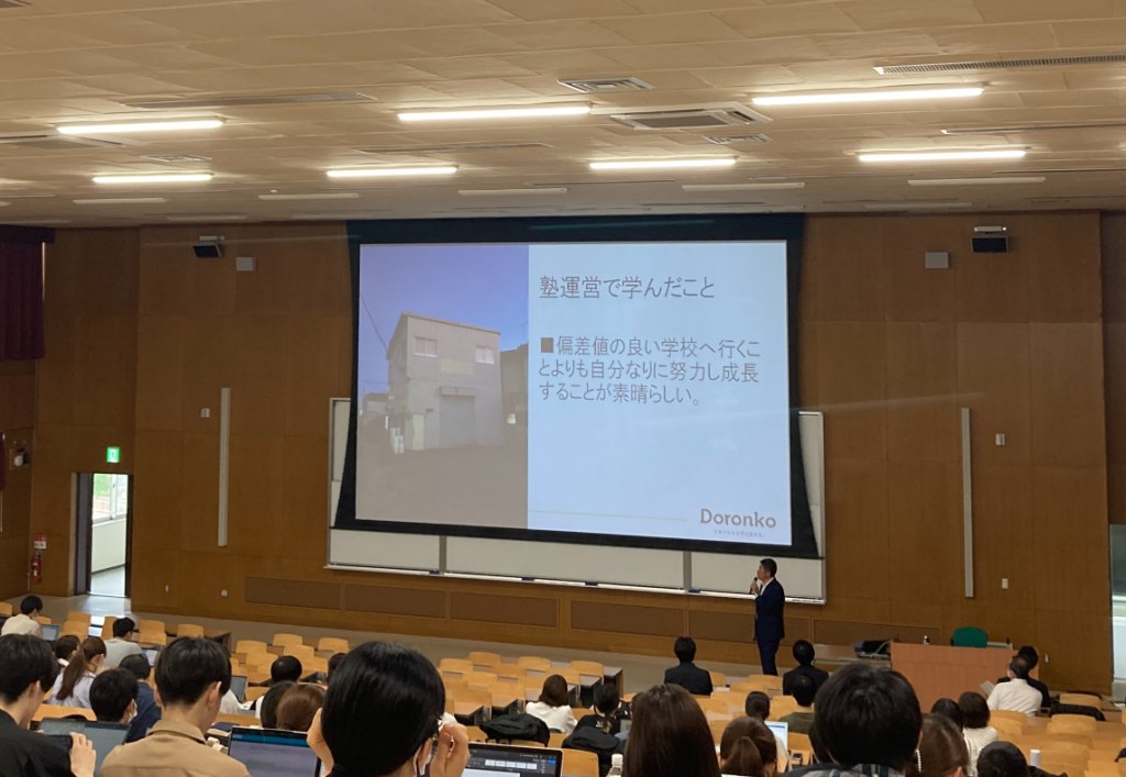 高堀代表は自己紹介で、大学2年生の時に小学生、中学生対象の学習塾を立ち上げ、多くの不登校児、障害児の学習支援に関わってきたことを話しました。塾運営から高堀代表自身が学んだことは「偏差値の良い学校へ行くことよりも、自分なりに努力し成長することが素晴らしい」ということ。学校に行けなくとも、塾で自分なりに学習に取り組み、進学する子どもたちの姿を目の当たりにして、周りと比較し評価するのではなく、その子自身が自分の中でどれだけ成長するかが大切であることを大学生に語りかけました。