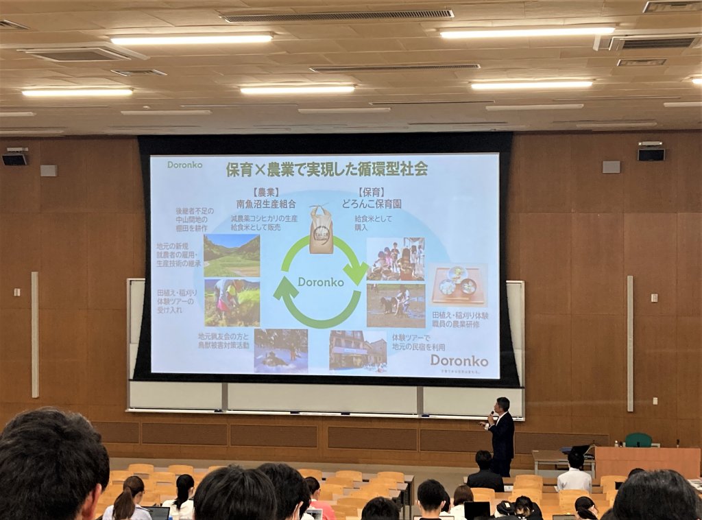 後半は、今回のテーマ「福祉×農業。地域や日本を良くする私たちの挑戦。」の核心部分を講義。農業(米と野菜の生産)では、子どもたちの生きる力を育むために始めた新潟県南魚沼市での田植え・稲刈り体験ツアーで、後継者不足などで日本の米作りが危機的状況に陥っていることを痛感し、地域の農家の方たちと株式会社南魚沼生産組合を設立したことを話しました。全ての人が「生きる力」をもって、よく生きられる社会を創るための今後10年の展望も話し、講義は終了。