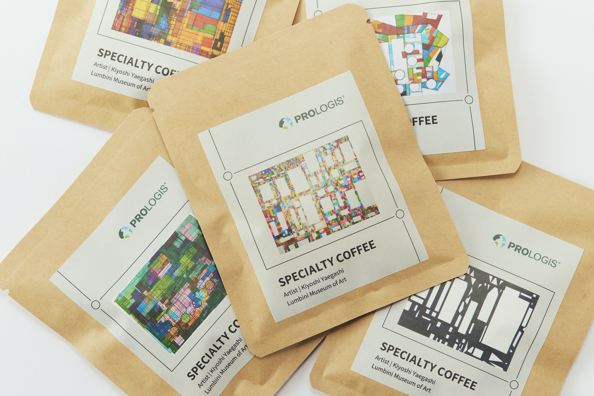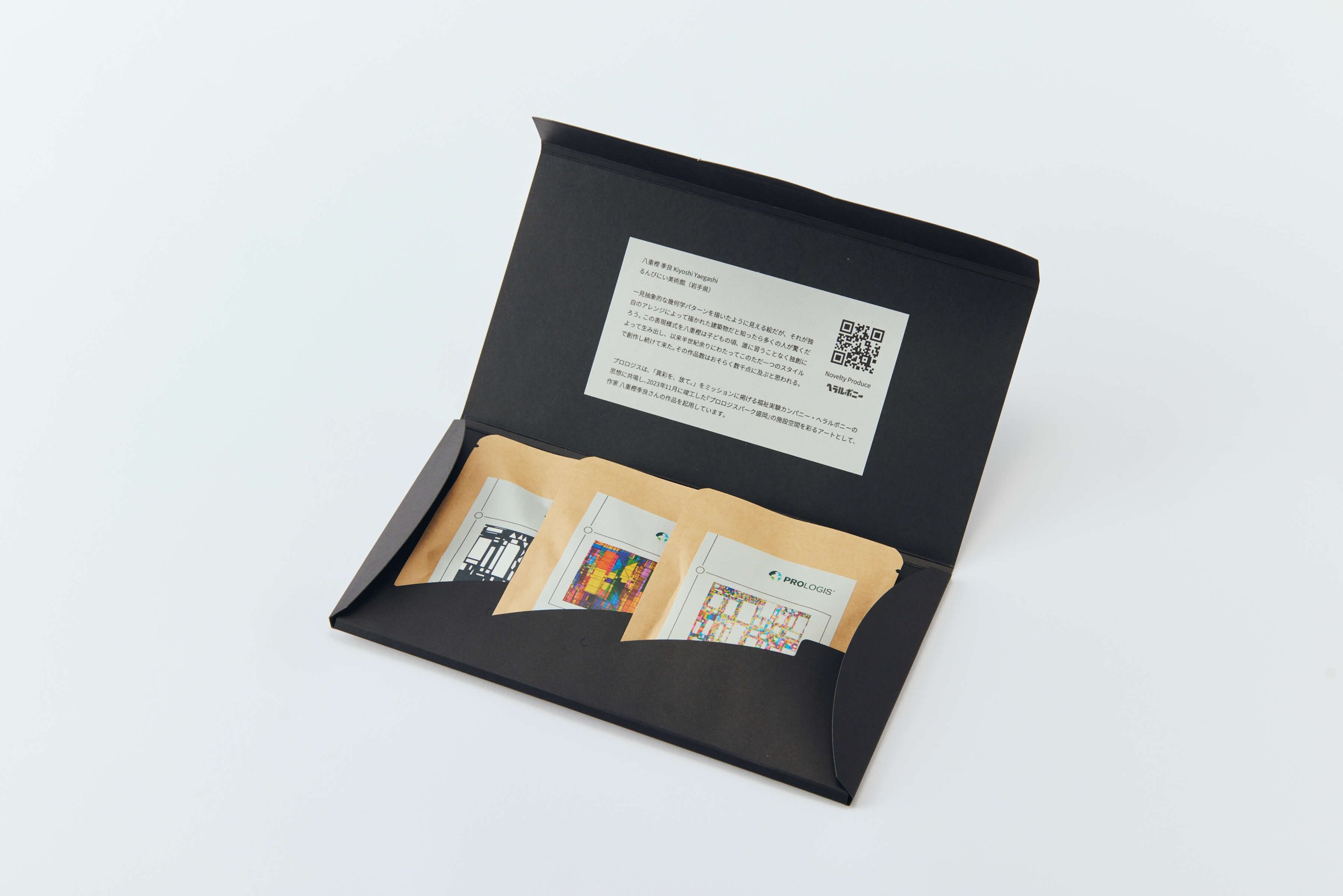 今回はプロロジスからのご依頼を受けて株式会社ヘラルボニーがコーヒーのギフトを探していたところに、どろんこ会との出合いがありました。就労支援つむぎ 武蔵野ルームの自家焙煎珈琲のドリップバッグのパッケージに八重樫さんの作品をあしらい、プロロジス専用のギフトが誕生したのです。