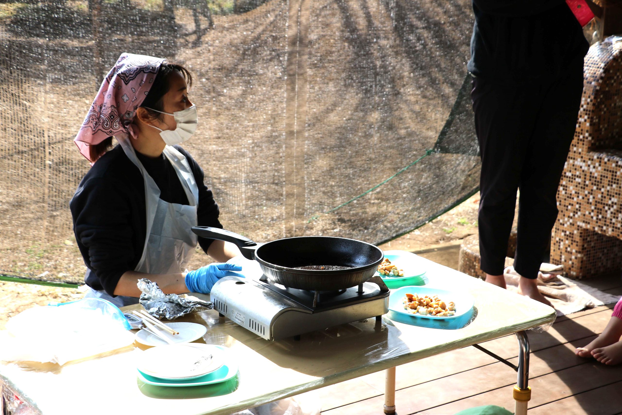 解体後は縁側にコンロを用意してフライパンでシンプルに塩のみの味付けで焼き上げ、いよいよ試食です。出来上がるまで子どもたちと鶏にまつわるクイズを楽しみ、この会への意識が途切れないような工夫をしました。