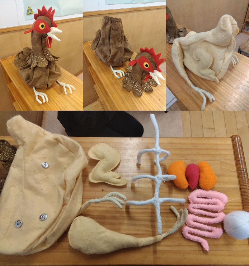 そこで3歳児以上の子どもたちには、「命をいただく」会でどのようなことを実施するのかを丁寧に話しました。調理スタッフが鶏の人形を手作りし、解体し、内臓を取り出す様子などを本番さながらに見せたことで、子どもたちもイメージしやすかったようです。