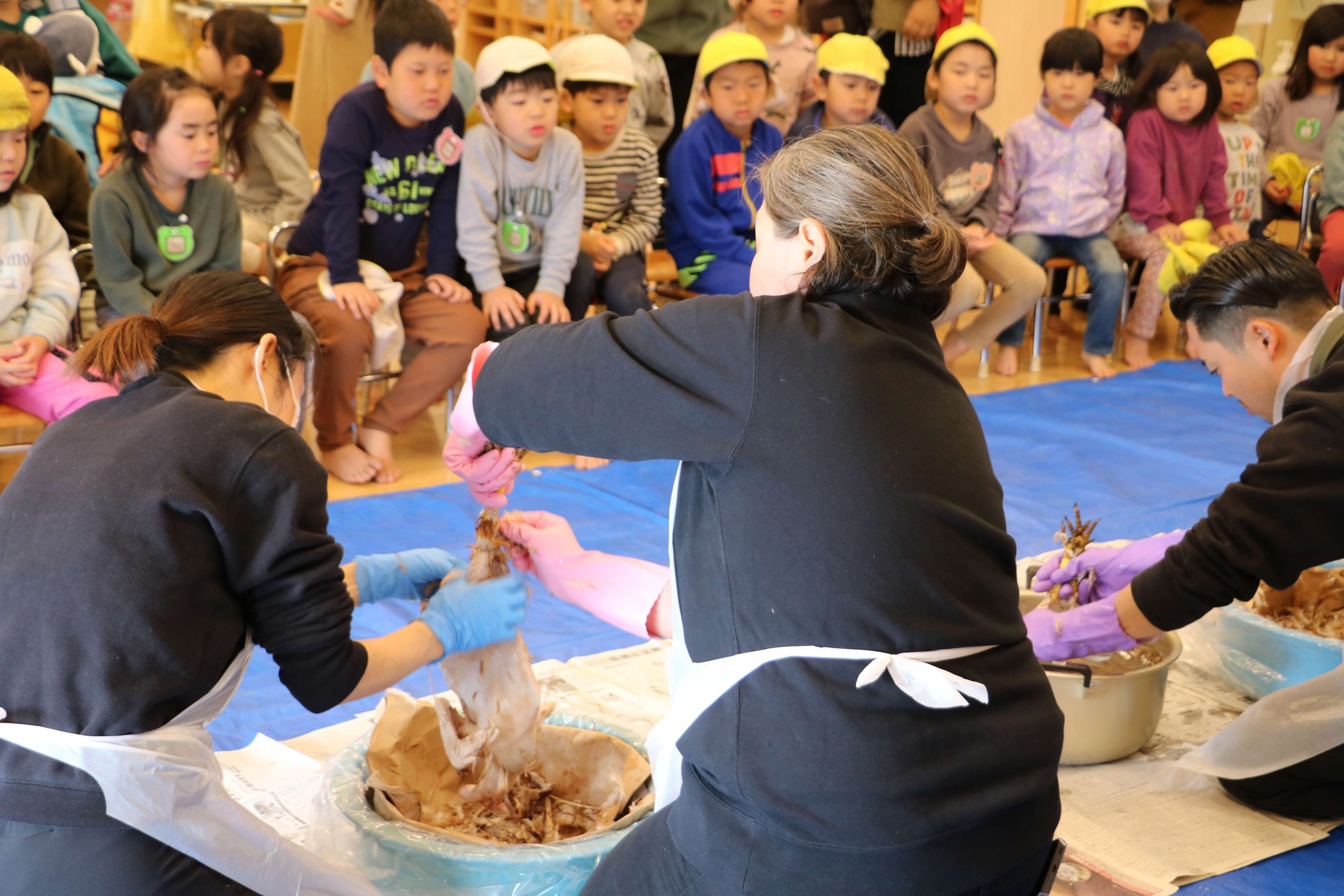 どろんこ会グループでは、日ごろから「命あるものを食している」ということを子どもたちが学べるよう、スタッフが自ら魚をさばいたり、鶏を絞めたりして、一緒にいただくという活動をしています。