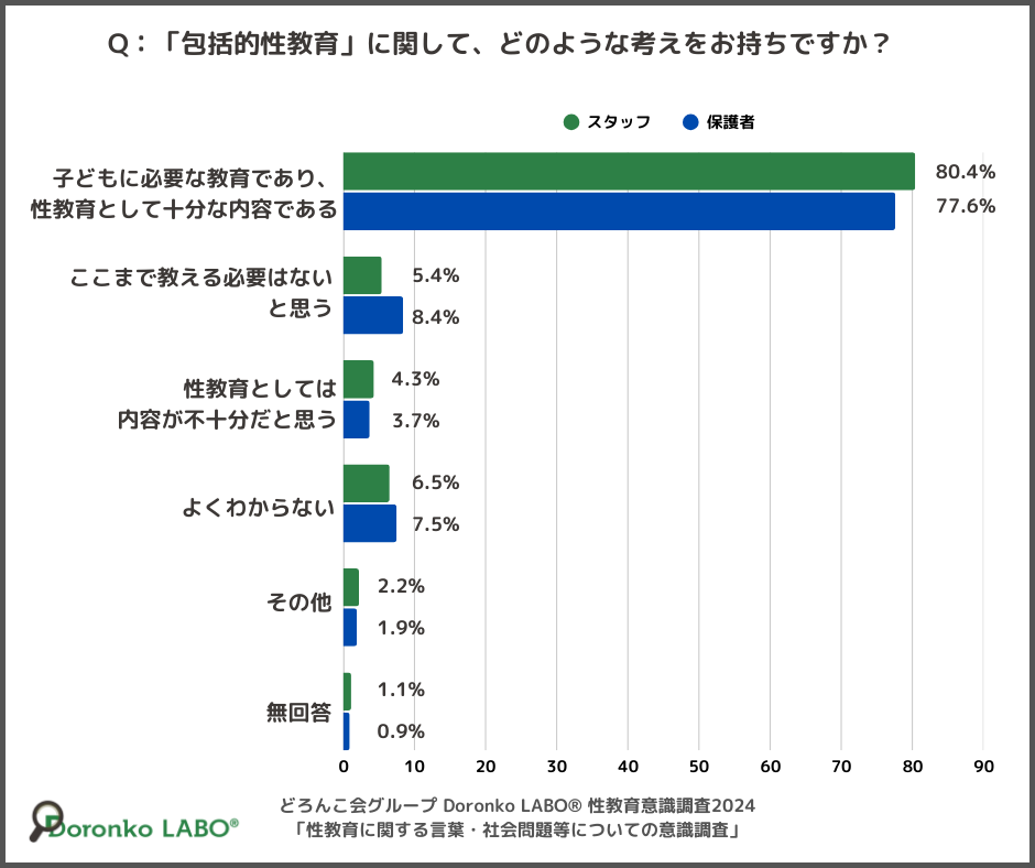 「包括的性教育」について、「内容も含めて知っている」と回答したスタッフ、保護者にどのような考えを持っているかを質問したところ、「子どもに必要な教育であり、性教育として十分な内容である」と回答したスタッフは80.4%、保護者は77.6%でした。
