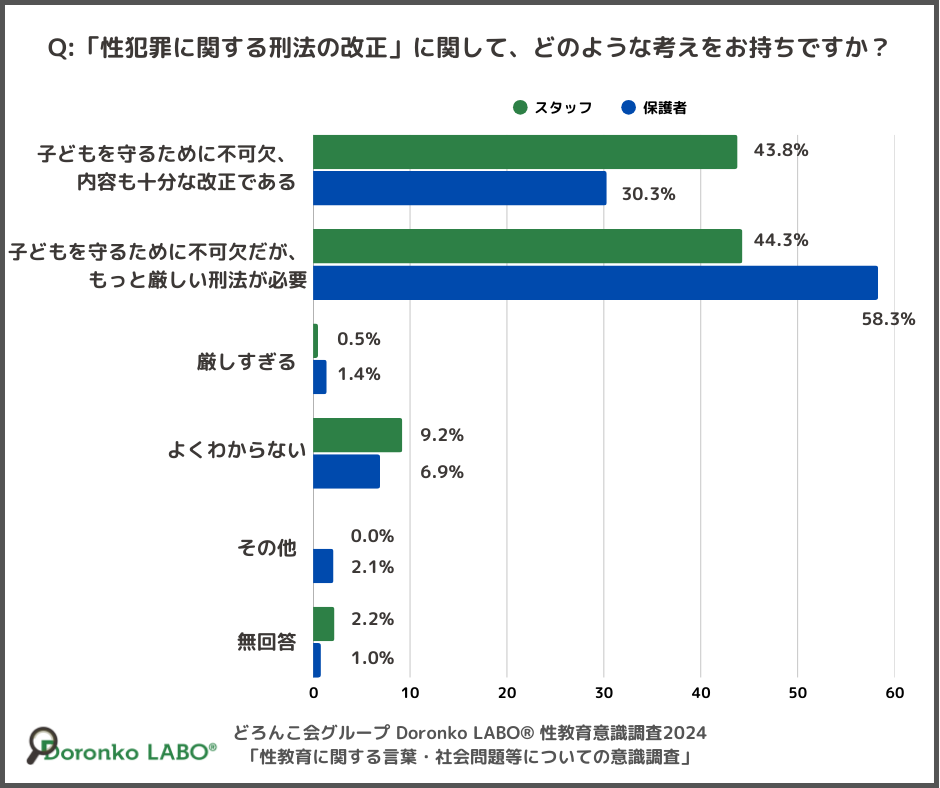 一方、「もっと厳しい刑法が必要」と回答したスタッフは44.3%、保護者は58.3%でした。