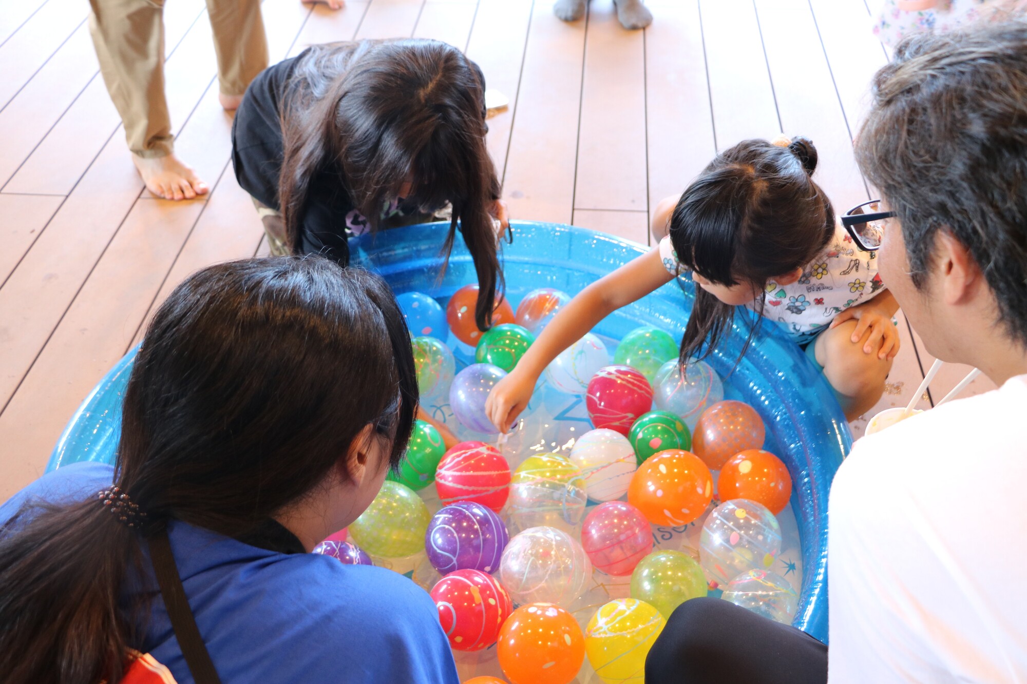 そのほか、「焼きそば」「スーパーボールすくい」「ヨーヨー釣り」などのお祭りらしい出し物はもちろん、家族全員で楽しめる「うちわ」などの製作、手作りフォトスポットなど、屋外だけではなく室内の遊びも盛りだくさんです。また、小規模な園ならではのアットホームな雰囲気を直接肌で感じていただくことができるのも、どろんこ祭りのよさです。