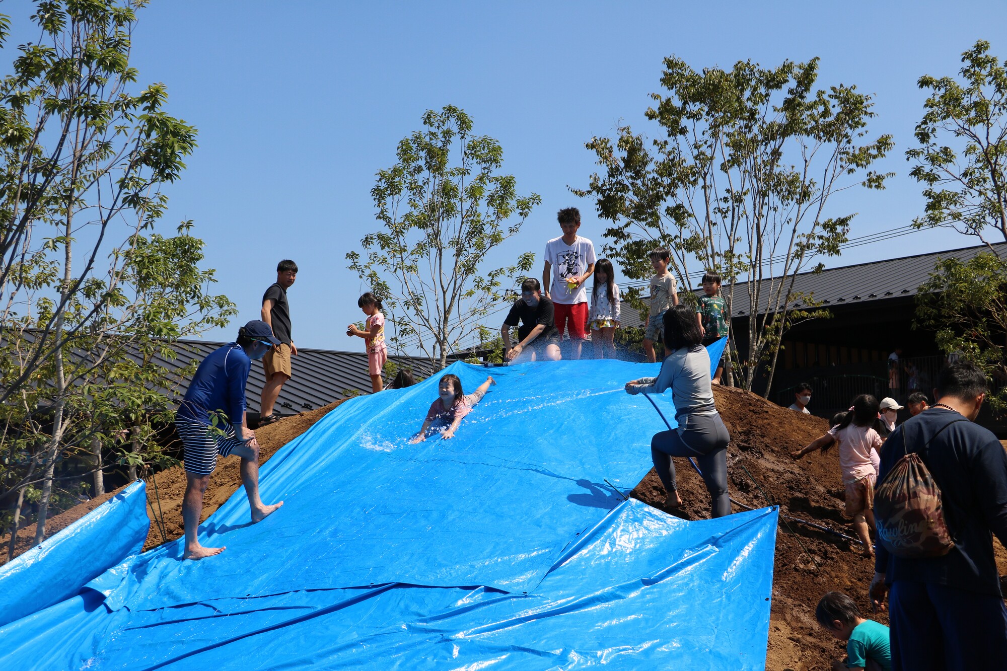 それぞれの園が持つ特色を生かしながら、来園するすべての方に楽しんでいただけるよう、どろんこ祭りの準備を進めています。 園庭の広い園のビッグイベントはなんといっても「どろんこスライダー」。子どもたちが日々登って遊ぶ築山から水を流して滑り降りる夏だけのお楽しみです。子どもも大人も、文字通りどろんこになって遊ぶことができます。