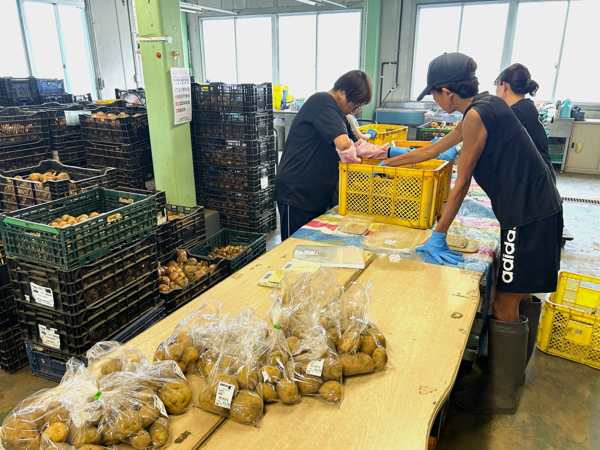 各地で栽培された農産物はいったん当施設に集められ、出荷に向けた準備を行います。当日も、明るい笑顔で手際よく野菜を選定・計量し、袋詰めを行うスタッフの姿がありました。