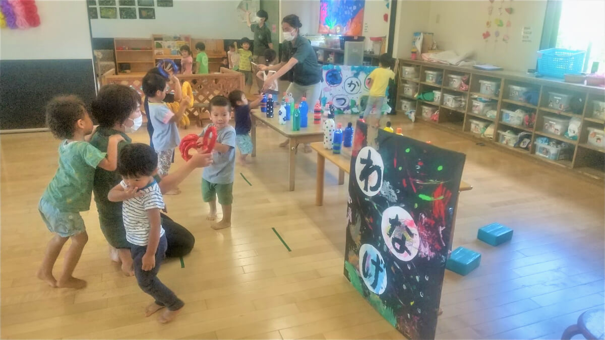 朝霞どろんこ保育園の子どもたちも、プールや川遊び、虫探しにボディーペインティングなど、夏ならではの遊びを思いっきり楽しみました。夏といえばお祭り!ですが、保育園での恒例行事「どろんこ祭り」も、昨年度に引き続きコロナウイルスの影響で開催できなかったため、今年は子どもたちだけで夏まつりを開催することになりました。