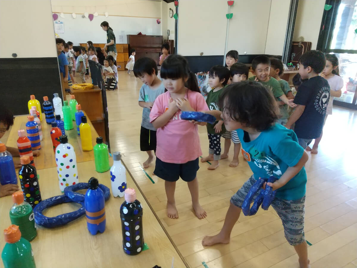 「プラネタリウム」「輪投げ」「ボール入れ」「魚釣り」「宝探し」など、たくさん並んだ素敵なお店に子どもたちは大喜びで、「いらっしゃいませ!」年長の子どもたちの元気な声に引き寄せられ、お店は大盛況です。目をキラキラと輝かせ、今か今かと順番を待っている子どもたち。輪投げが成功したり、魚が釣れたりするたびに、「やった!」と店員さんと笑顔でハイタッチをしていました。