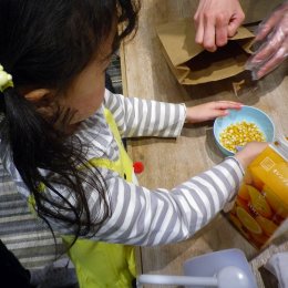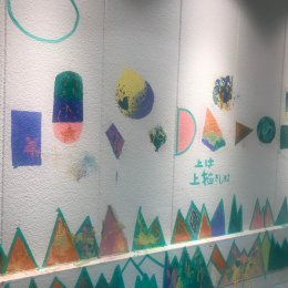 製作が大好きな4歳児クラスはグループごとに分かれ、4歳児クラスの名前の「むぎ」という文字をそれぞれのグループでテープや折り紙など色んな素材を使ってデコレーションしました。最後にパズルのようにくっつけて自分たちの「むぎ」という作品を作り上げました。色とりどりの「むぎ」という文字に、子どもたちも嬉しそうな表情を見せていました。