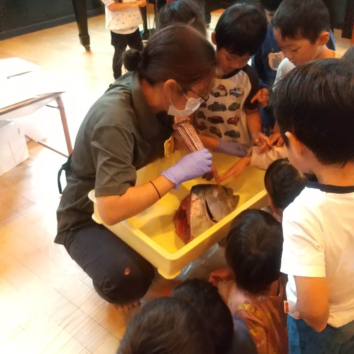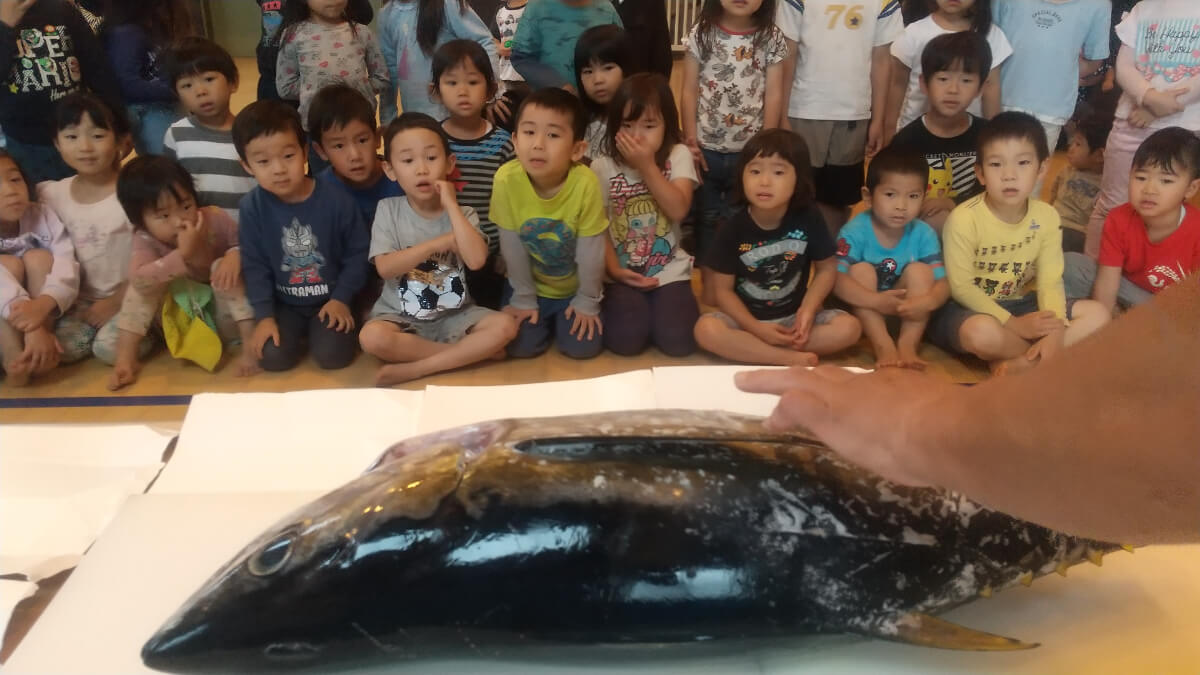突如現れた大きなマグロを前に子どもたちは身を乗り出して見るほどに興味津々で、お寿司屋さんやスーパーで売っている加工済みのものではなく、丸々一本のマグロの大きさに驚き、不思議、怖さなどたくさんのものを感じとっていました。