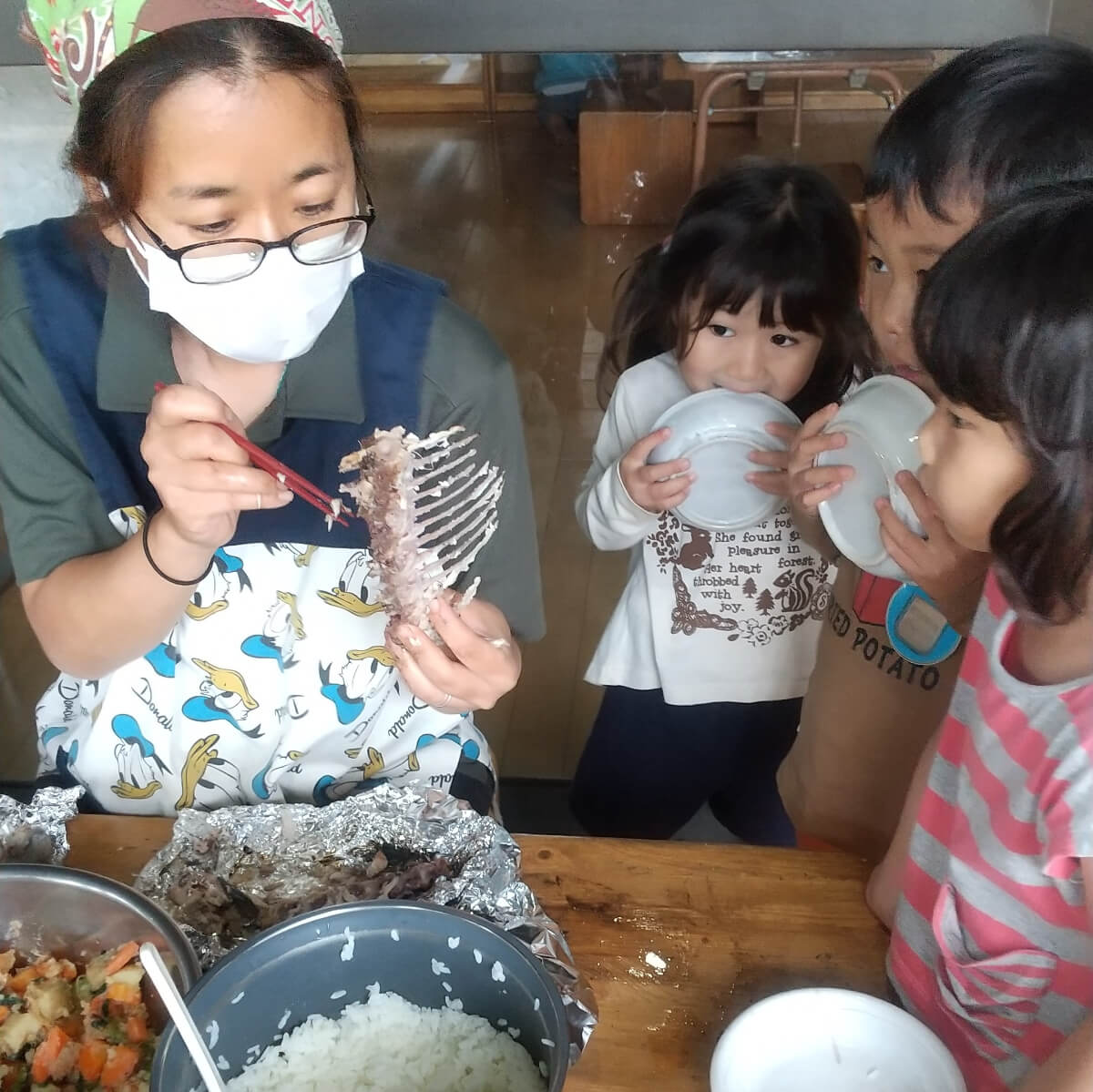 さあ、待ちに待った給食の時間です。いつもの給食とは子どもの目も雰囲気も違い、颯爽と食べる場所に集まりました。解体を見た影響もあり食への関心が高まっていました。通常のご飯に追加して配られたマグロを、子どもたちは「おいしい!」「おかわり~!」とどんどん食べ進めていました。途中には身をほぐした後の骨などを保育者の説明を聞きながら見つめている姿も見られました。