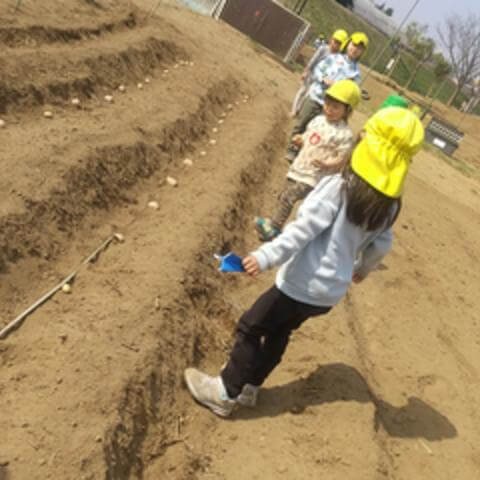 晴天のある日は、こめ組の友達と畑にじゃがいもの種芋を植えました。まずは、大人に種芋の植え方を教えてもらいます。「なんでじゃがいもをうえるの?」「ちいさなたねからできるんじゃないの?」と子どもたちの疑問が湧いてきました。「じゃがいもには芽があって、そこからみんなが食べるじゃがいもができているんだよ」と伝えると「だから根っこが生えてるんだね」とイメージをする子もいました。