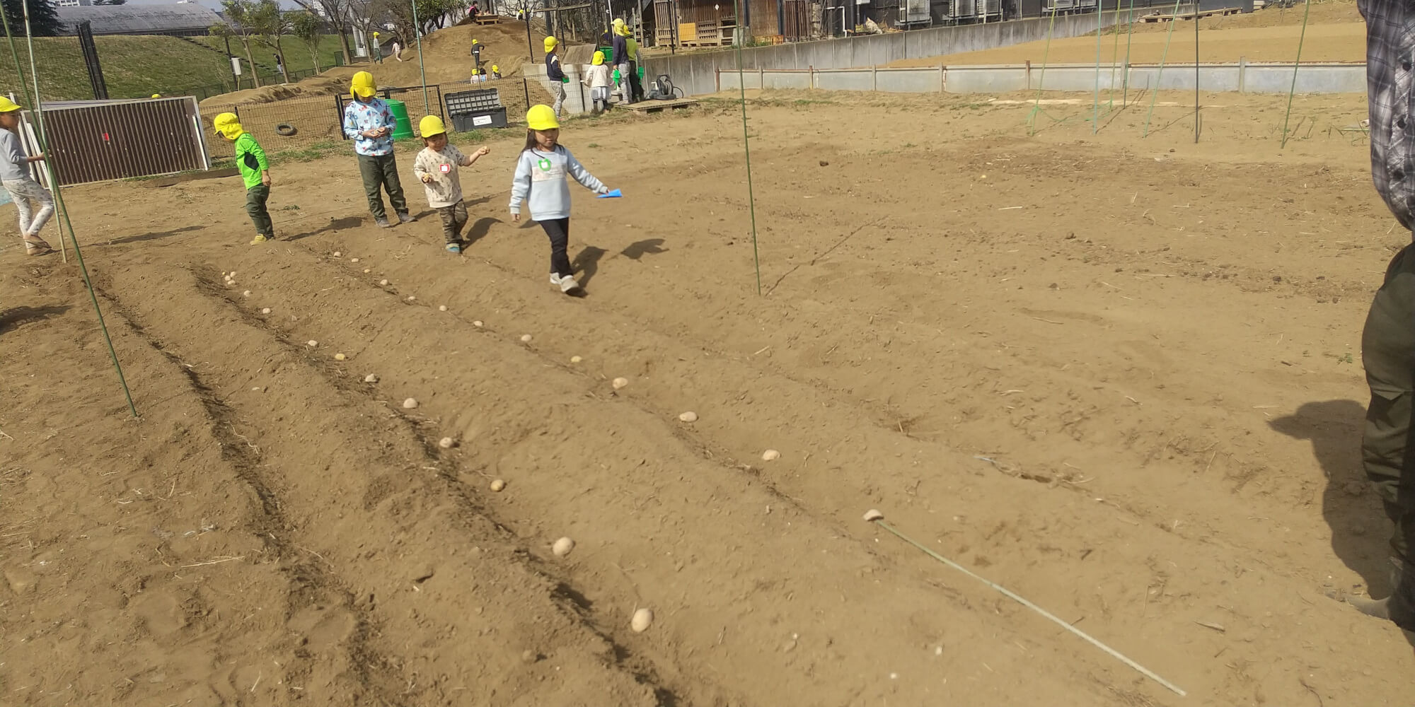 等間隔に種芋を並べるため、小さな友達も一緒に種芋を運びます。こめ組が率先して「このくらいかな?」と率先して位置を確認します。みんなできれいに並んだその景色を眺めました。そして最後の工程はみんなで力を合わせて土をかぶせます。