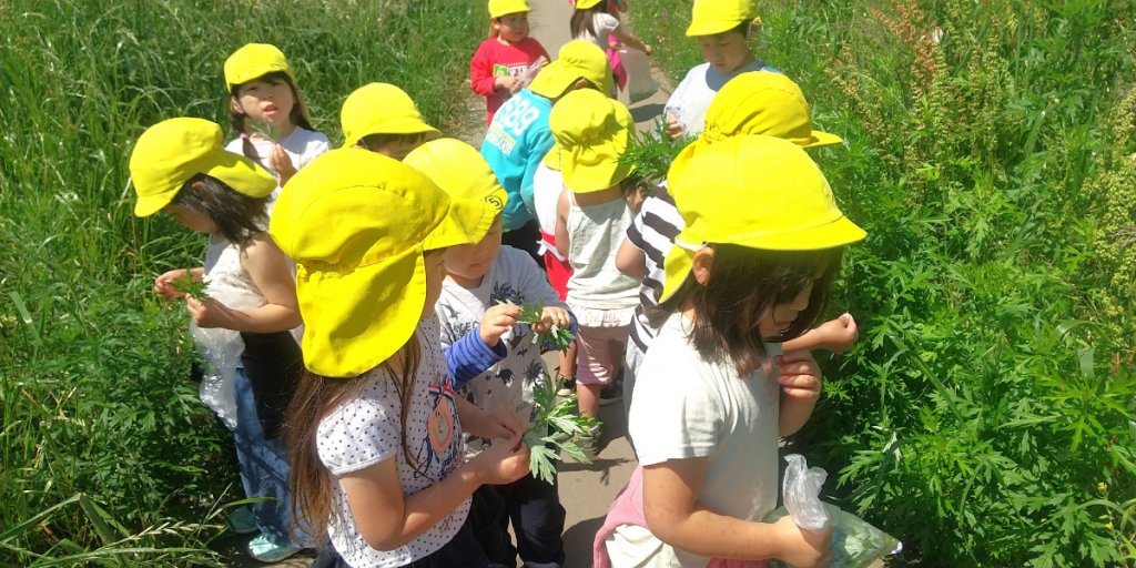 土手にはたくさんの草花が咲いていますが、その中には食べても大丈夫なものが多くあります。その一つがヨモギです。散歩に出かけた子どもたちは袋を手にして「うらがしろいやつ?」「はっぱがギザギザしてるやつかな?」と話しながら集めていました。