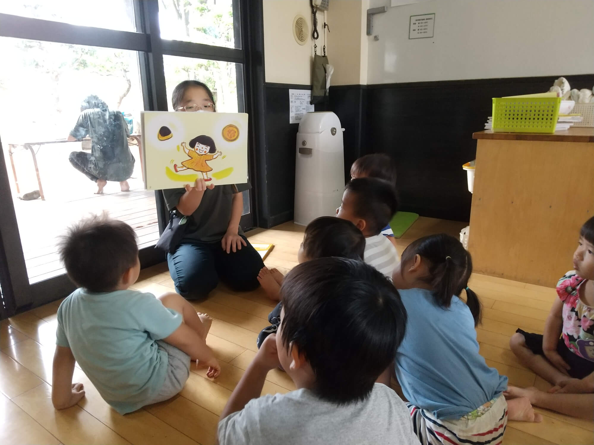 お米を使ってお煎餅作りをしました。まず『おせんべやけた』の紙芝居を子どもたちの前で読むと「おせんべおせんべ焼けたかな?」のリズミカルなテンポに合わせて、保育者が手遊びをすると子どもたちも真似をして、「おせんべおせんべ」と歌っていました。煎餅の種類にはどんなものがあるのか、煎餅はどのように作られているのかを紙芝居を通して見ていきました。「あ、これ食べたことある!」「知ってるよ!」など子どもたちそれぞれで感じたことを話していました。