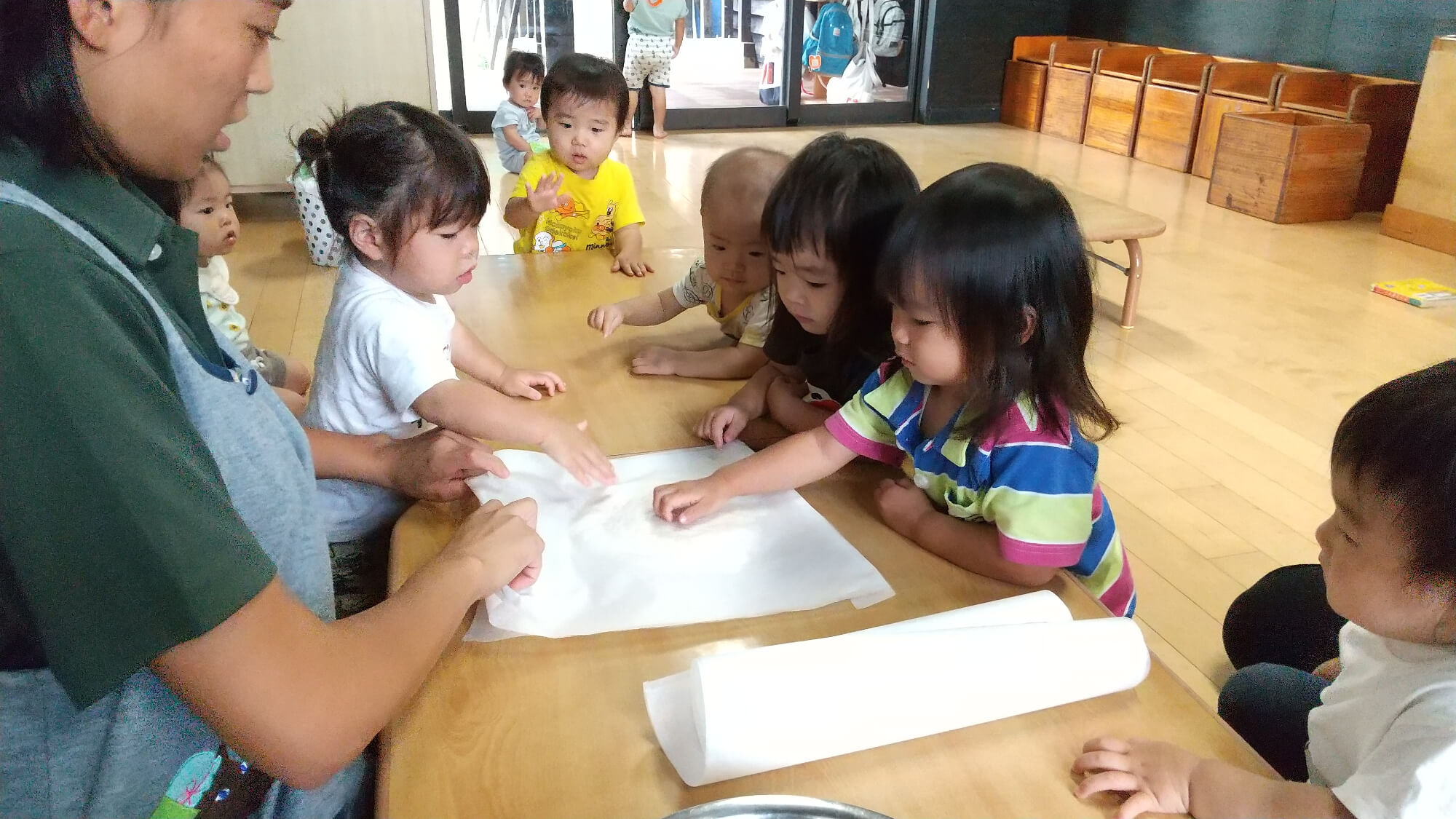 紙芝居で煎餅の作り方を知った後は、いざ実践です。クッキングシートの間に炊き上がったご飯を乗せ、みんなでぎゅっぎゅっと煎餅のように平たくなるよう押していきます。お米が潰れていく感触や温かさを感じながら、0,1歳児も一生懸命煎餅作りに励んでいました。
