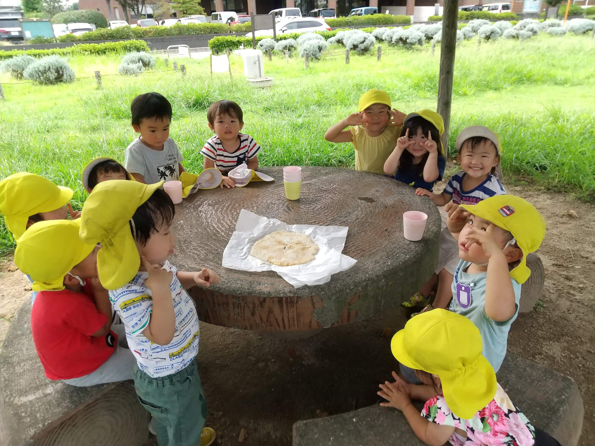 2歳児は、出来上がった煎餅を散歩先の公園まで持っていきピクニックをしました。公園に向かっている最中も「早くおせんべいたべたい~!」「おなかすいたよ~!」と期待感をもって歩いていました。いざ、食べてみると「おいしい~!」と子どもたちの素敵な笑顔がたくさん溢れていました。自分たちで作った煎餅のおいしさは格別ですね。ご飯を自分たちでせんべいにすることで食のありがたみ、美味しさを改めて実感することができた子どもたちでした。