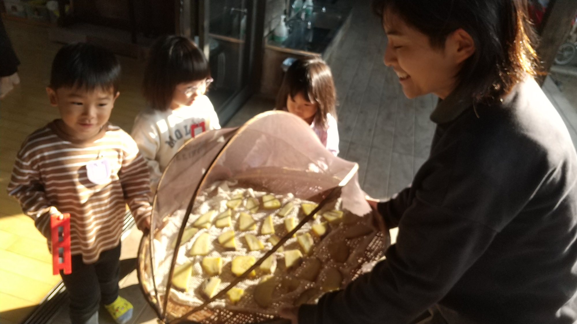 それから雨の降った日の後、カビができてしまい、子どもたちと「干し芋作り」に再挑戦しました。毎日縁側に天日干しをして、「まだかな?」「なんかシワシワになってきた!」と食べごろを見極めています。