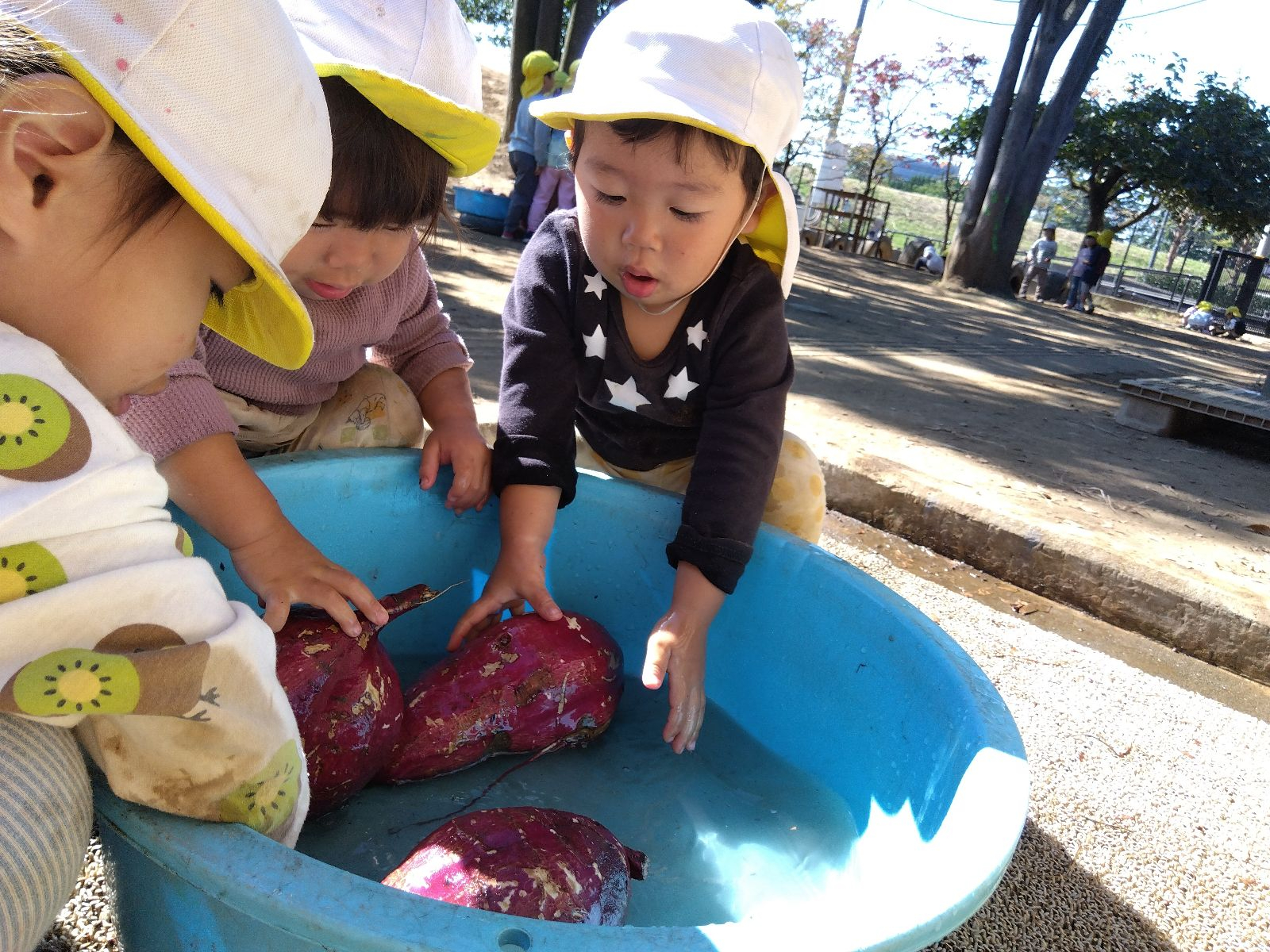 乳児の子どもたちも縁側先でさつま芋洗いに挑戦です。泥が落ちてピカピカになると、「みて?」「きれい!」と食べる為の下準備も楽しい活動です。小さく切って蒸かしたさつま芋をみんなで頬張ると「おいしっ」「おかわりー」と秋の味覚に夢中でした。