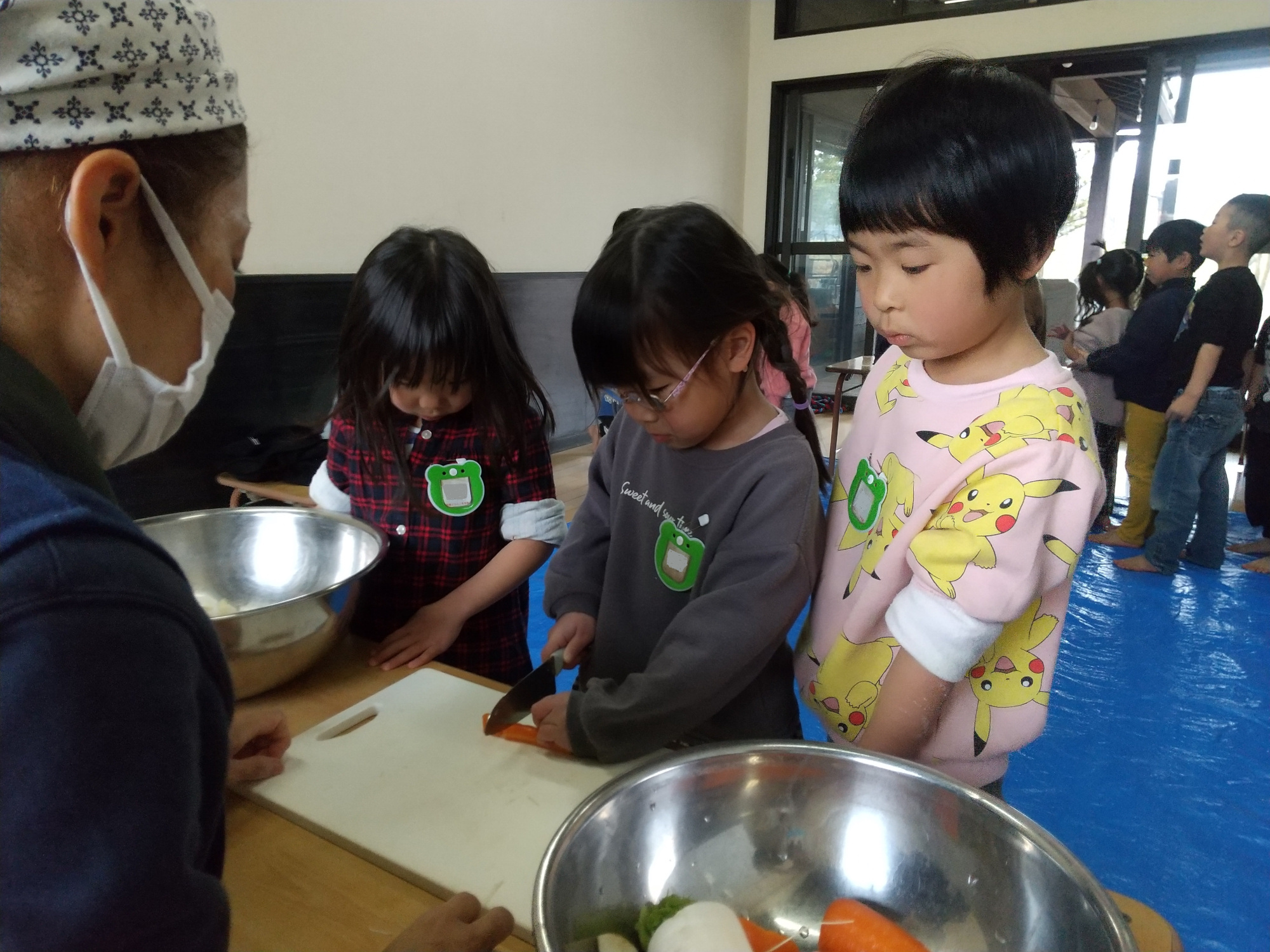 生地がまとまった後は棒でよく延ばし、うどんの形状に切り、その後にうどんの具となる畑で収穫したホウレン草や大根も切っていきました。包丁を使う子どもたちの表情は真剣そのものでした。
