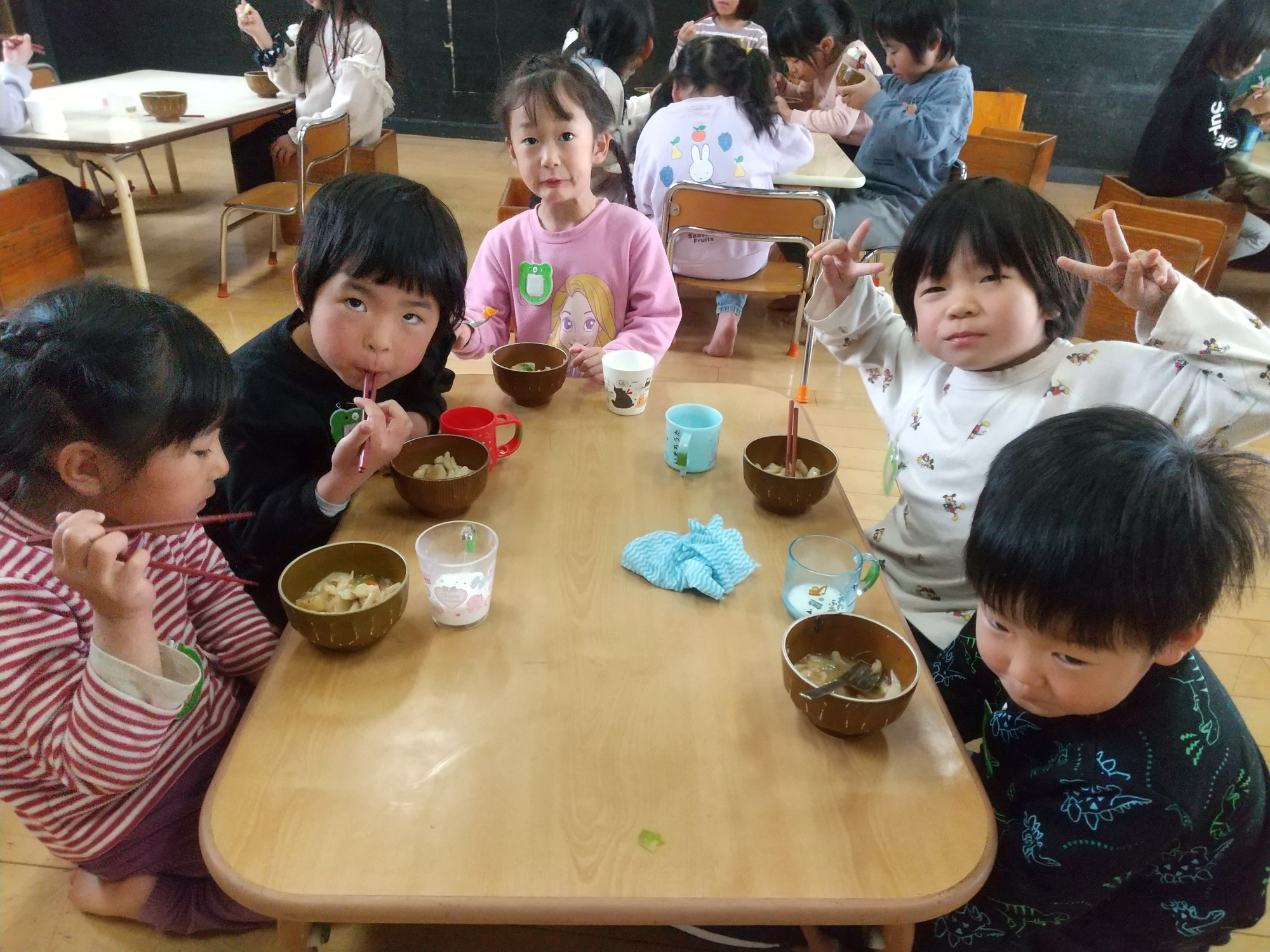 待ちに待ったおやつの時間です。皆で協力して完成したうどんの味は格別だったようで、「おかわりしてきたよ」「おいしかった」という言葉がたくさん聞かれました。