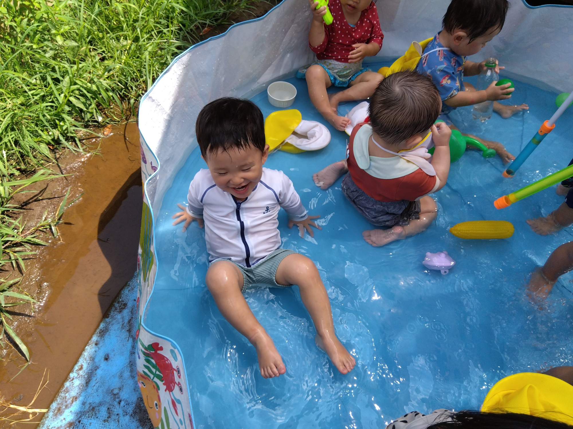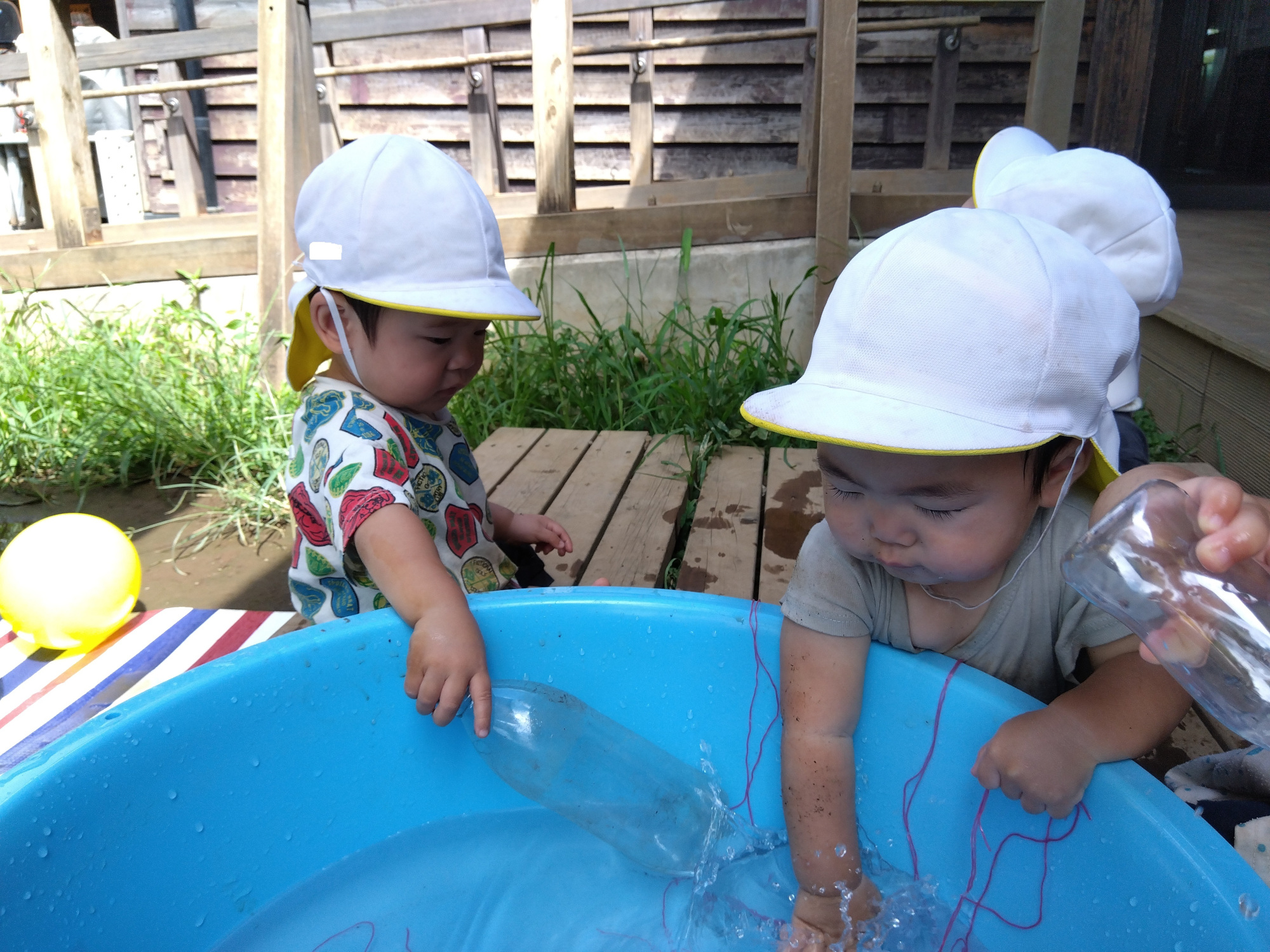 どろんこ保育園では、0歳児でも水と直接触れ合って遊ぶといった「直接体験」を大切にしています。実際に直接触れることで徐々に水にも慣れ、自分で水の面白さや遊び方に気づいていく姿があります。水遊びをたくさんした7~8月、今後はどのように水と一緒に遊ぶのか子どもたちの姿が楽しみです。9月も蒸し暑い日が続くので、水遊び・シャワー等でさっぱりとして、元気に過ごしています。