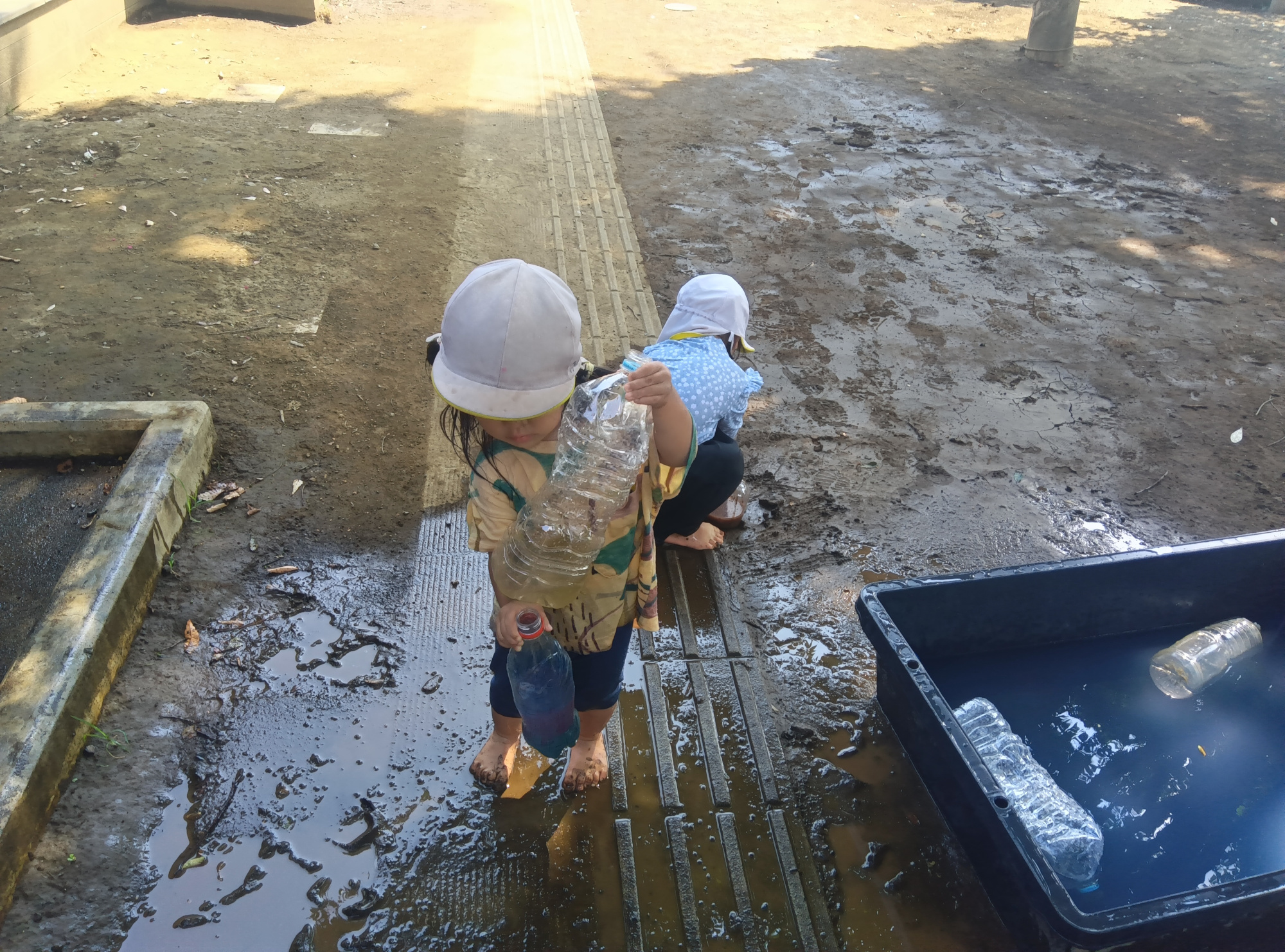 園庭に出るとペットボトルに水や泥をいれ、「いらっしゃいませ〜ジュースですよ!」とジュース屋さんごっこが始まりました。