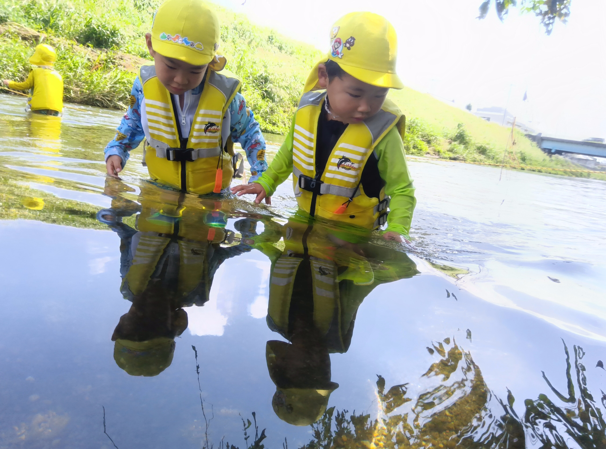 5歳児が1番手に川開きをしました。はじめは川の流れや深さが一定ではないプールとの違いに怖さを感じつつ、ロープを掴んで進みました。少しずつ慣れると上流から下流へ流れてみたり、網を使って生き物を探してみたりしていました。