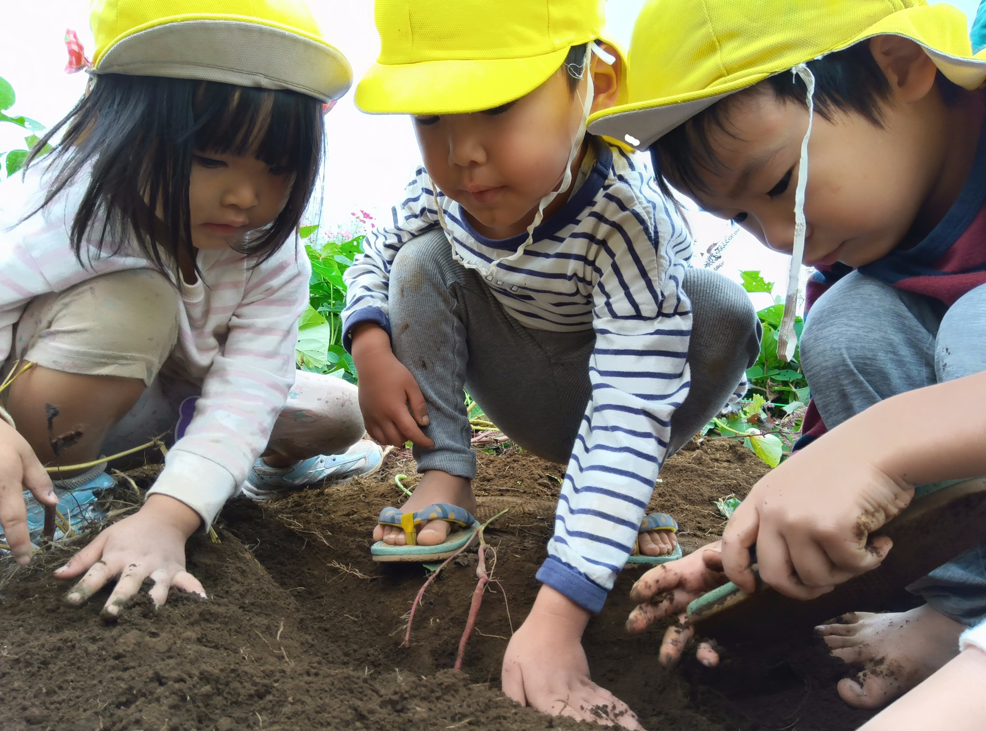 待ちに待った収穫。早速ツルを引っ張ってみると、サツマイモは1つだけでなく2つ3つと繋がっています。大きなサツマイモを目の前にした子どもたちは大興奮でした。「大きいサツマイモあったよ」「こっち手伝って」と声を掛け合ったり協力し合ったりして収穫を楽しんでいました。