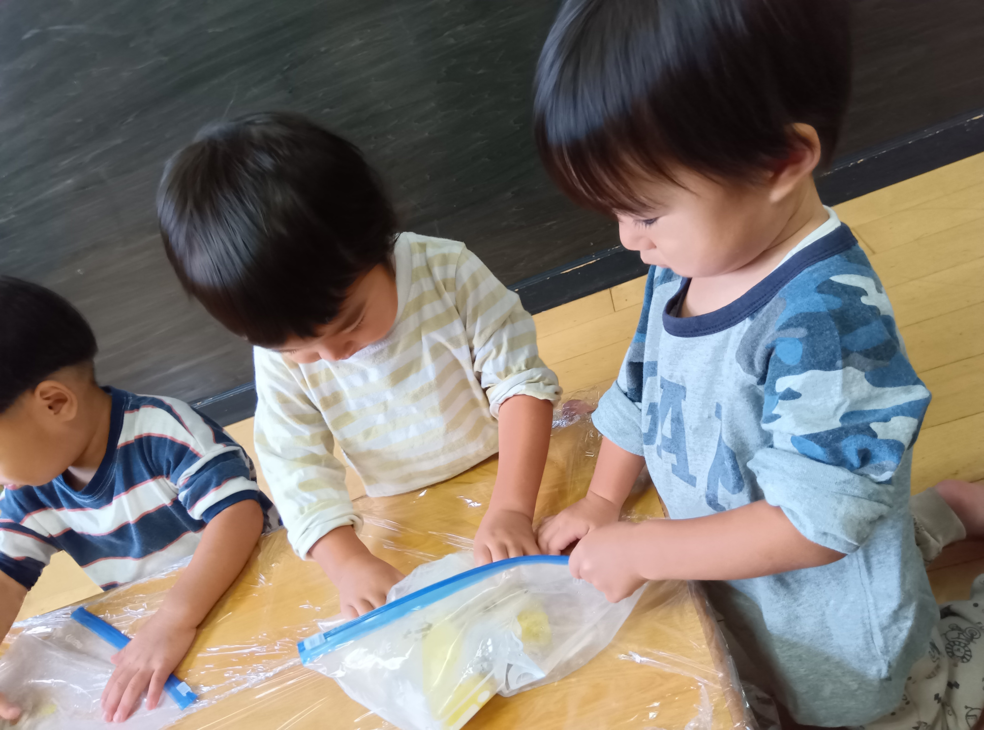 乳児クラスでは、個数が限られているジップロックを友だちと分け合いながら、一緒に手で潰します。言葉のやり取りが増えてきている1歳児クラスの子どもたちの中からは、「あっちいねぇ」「おいしそう!」等の言葉が出ていました。最後は0歳児も保育者と一緒に生地をカップに絞って完成です。
