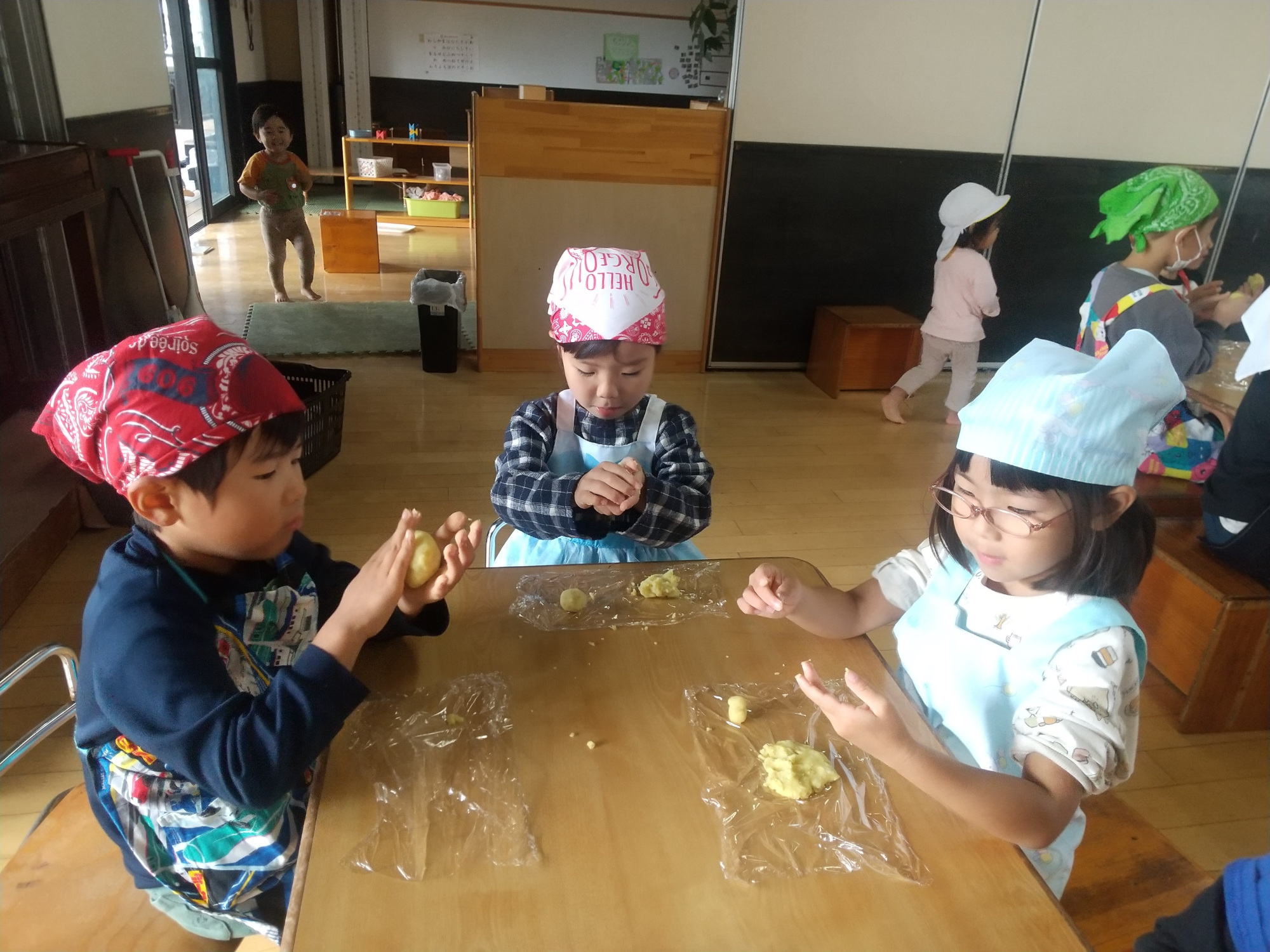 最初は素手で触ることに「触っていいの?」と躊躇していた子どもたちでしたが、触ってみると「やわらかい!」「あったかいね」と思い思いに話をしていました。「雪だるまにした!」「ハートにしようかなあ~」「星もいいな~」と友だち同士で話しをして考えながら一生懸命作っていました。想像力が豊かな子どもたちのスイートポテトはどれも素敵に仕上がりました。作ったスイートポテトはおやつの時間で美味しくいただきました。