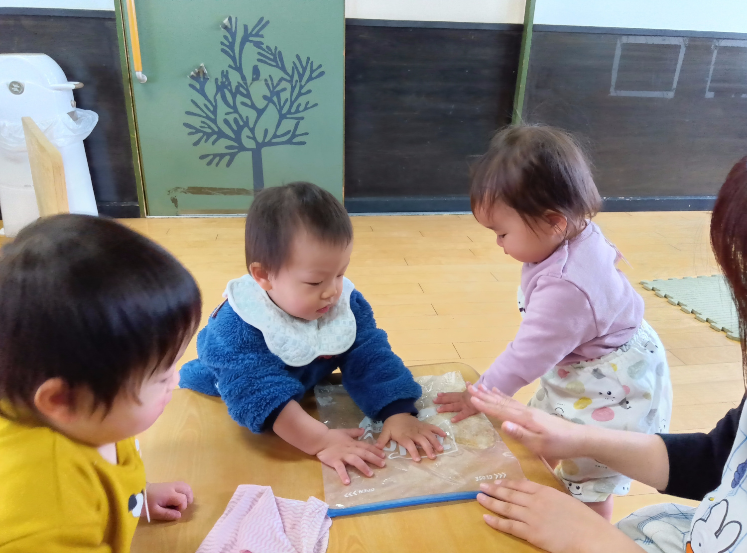 乳児クラスの子どもたちはビニール袋に入ったお米を友だちと一緒に「とんとん」と声を掛けながら潰していきました。潰れる感触を楽しみながら、お米がおせんべいのように平らになると「おいしくなるかな」と嬉しそうな笑顔を見せていました。