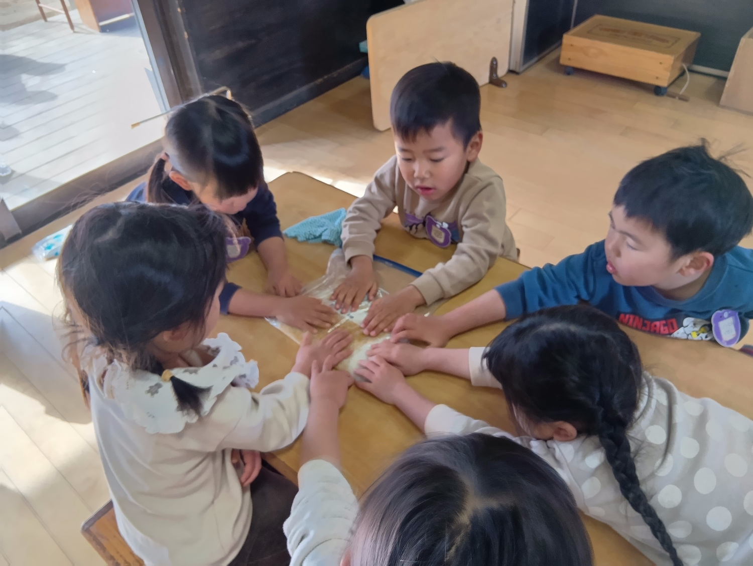 幼児クラスの子どもたちも、おせんべいづくりに挑戦です。クッキングシートでお米を挟み、丁寧に潰しながら本格的なおせんべい作りが始まりました。ひとりで黙々と潰す子もいれば友だちと協力しながら作る子もいて、潰し方も様々です。真剣な表情から子どもたちのおせんべいづくりに懸ける思いが伝わってきました。