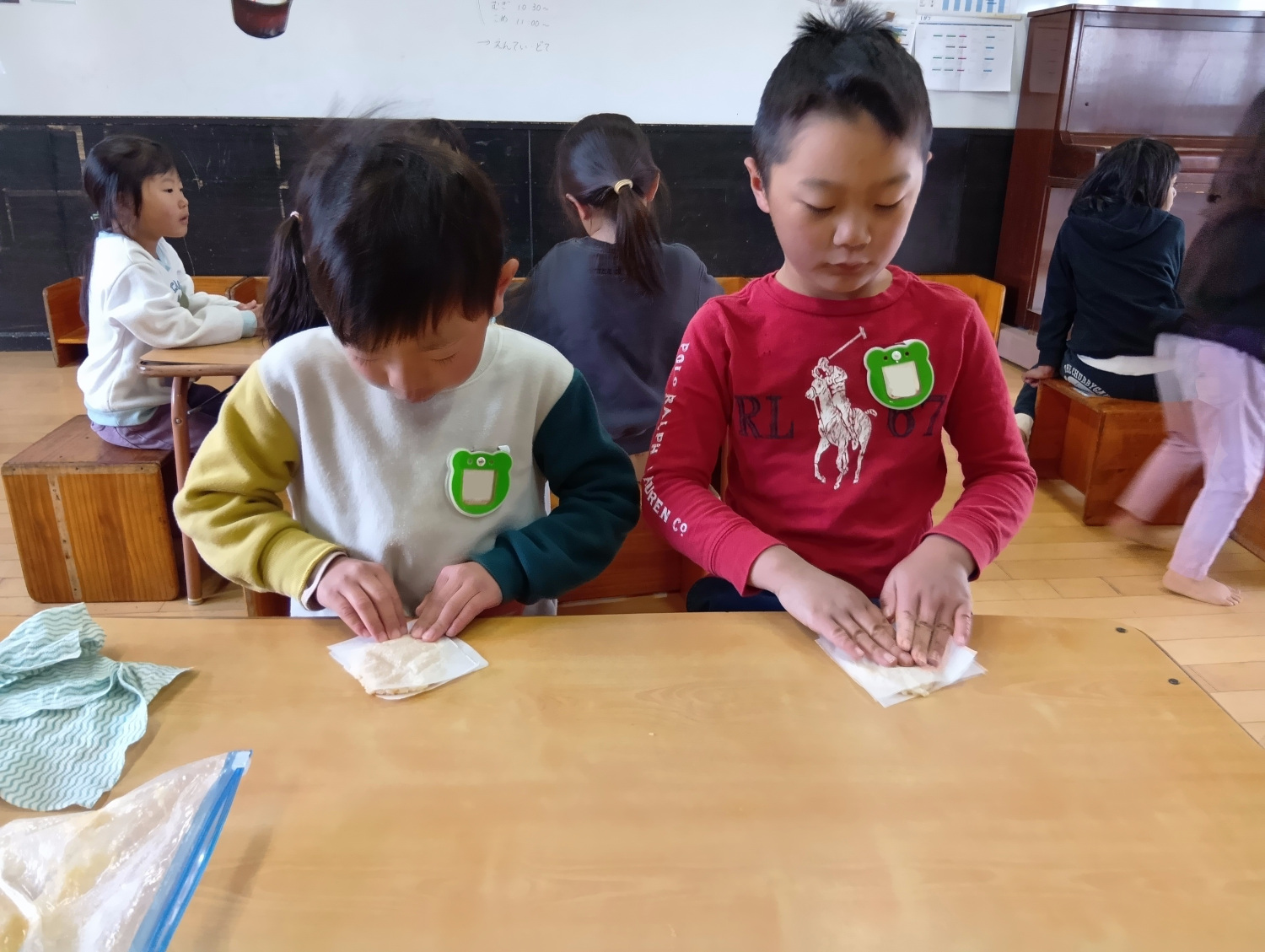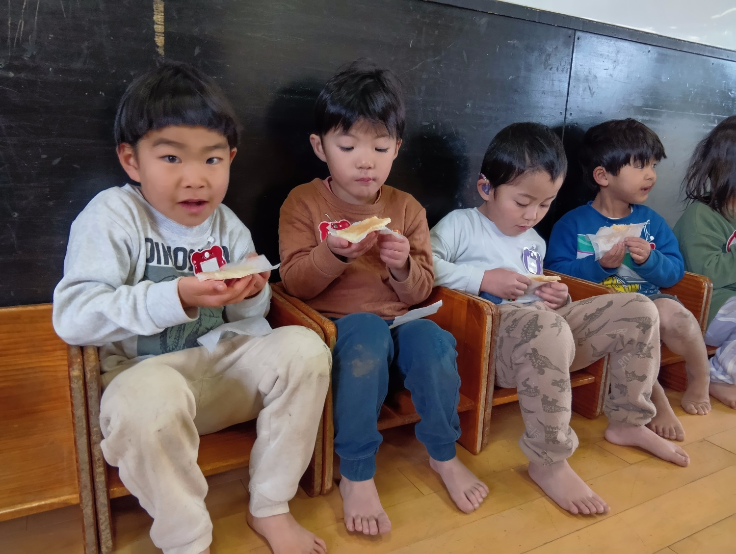 焼き始めるといい香りがしてきます。子どもたちは目を輝かせながら待ちきれない様子です。ようやく焼きあがると「ふーふー」と冷ましながら自分たちで作ったおせんべいを味わっていました。おかわりの手も止まらずあっという間に完食です。自分たちで作ったという事もあり、とても美味しかったということが子どもたちの表情から伝わってきました。