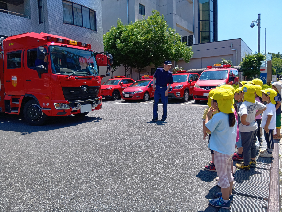 今回伺ったのは「朝霞消防署浜崎分署」です。到着するとまず出迎えてくれたのは、見たことのある真っ赤な車、消防車でした。消防車以外にも様々な赤い車が多くあることに驚きながらも、消防士の方に挨拶をし、消防車について説明を受けました。