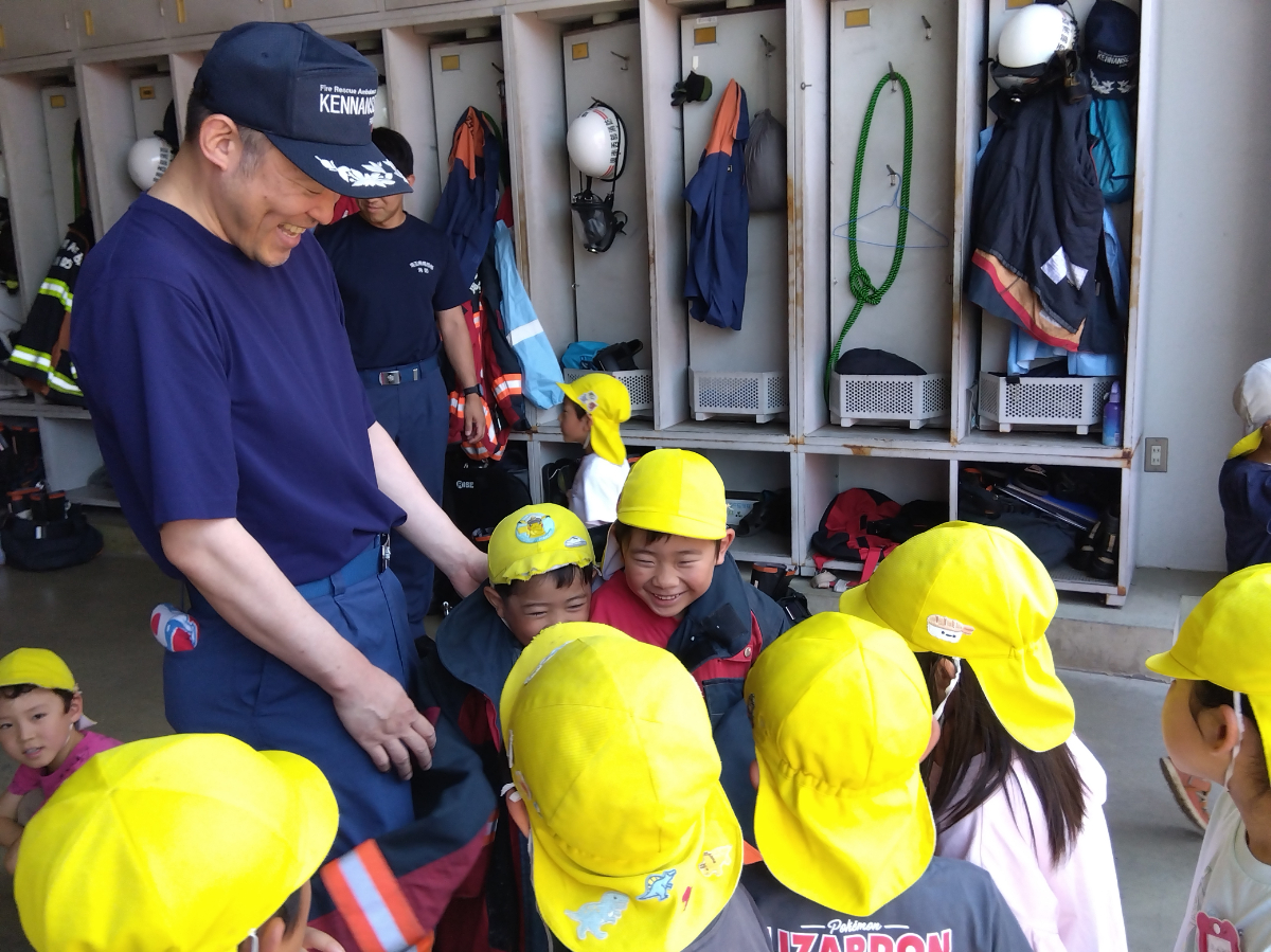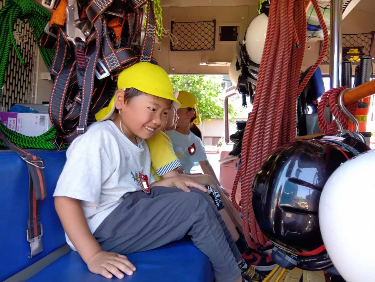 実際の車内に乗せてもらうと、ベルトやヘルメット、ロープに誘導灯など色々な道具が積まれており、触れたり、実際に持たせてもらうなど、重さや使い方を教えてもらいました。普段は目にしない道具に子どもたちの目がいつもよりキラキラと輝いていました。